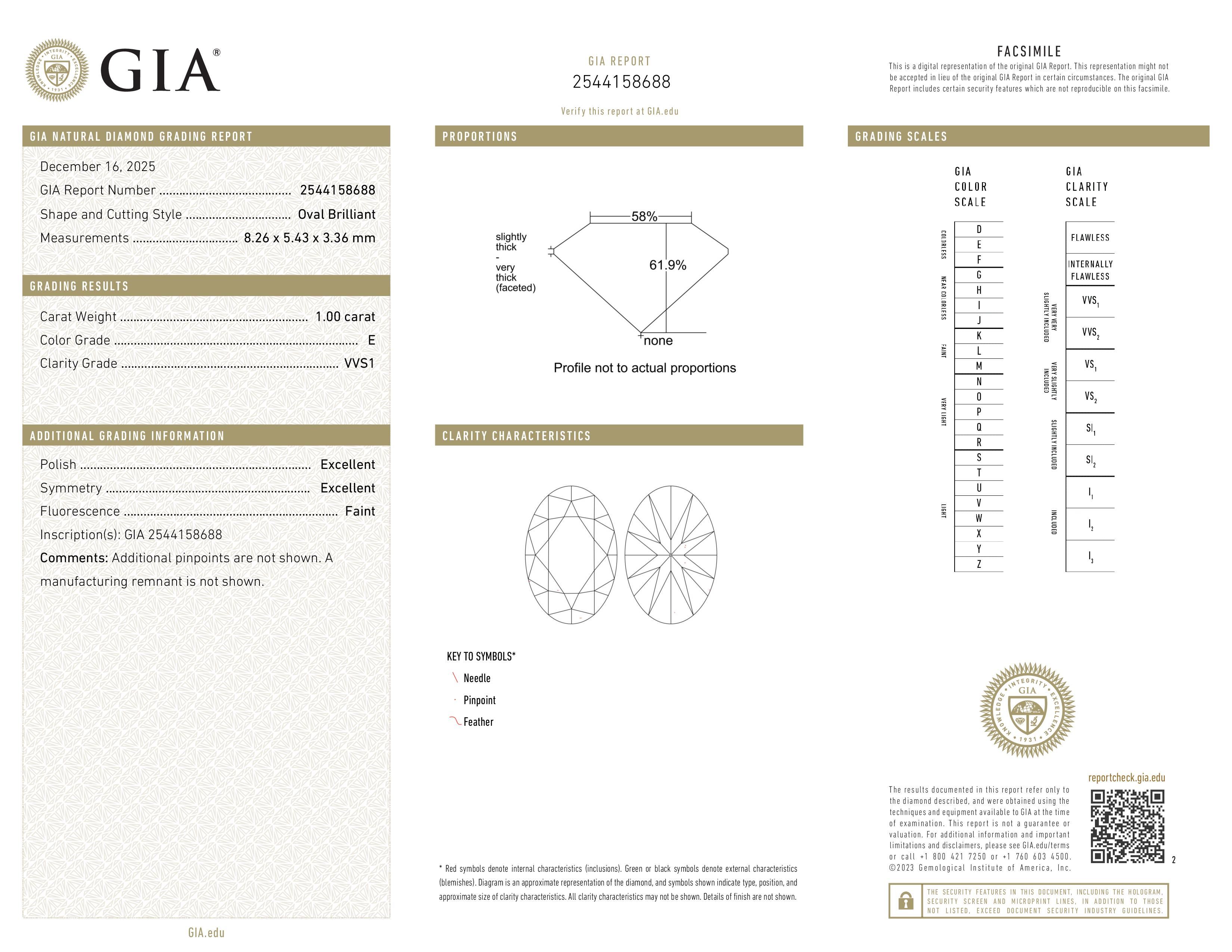(VVS1) This diamond has very, very small inclusions. The minute inclusions are difficult for even a trained grader to see under 30x magnification. VVS1 graded diamonds are very rare.