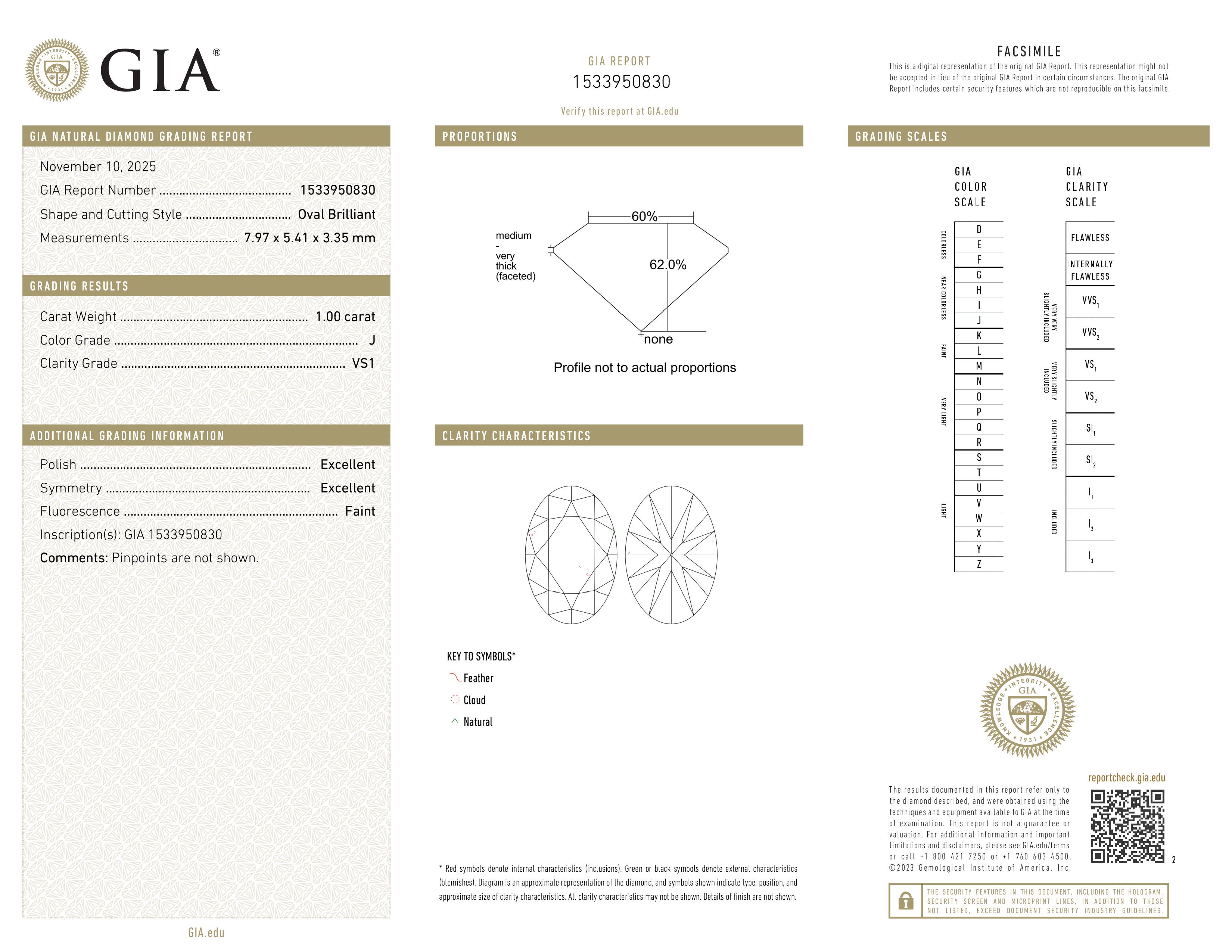 (VS1) This diamond contains very, few inclusions that are difficult for the untrained eye to see under 10x magnification. VS1 diamonds have no visible blemishes and are less expensive than higher clarity grades, therefore offering exceptional value while not compromising on quality.