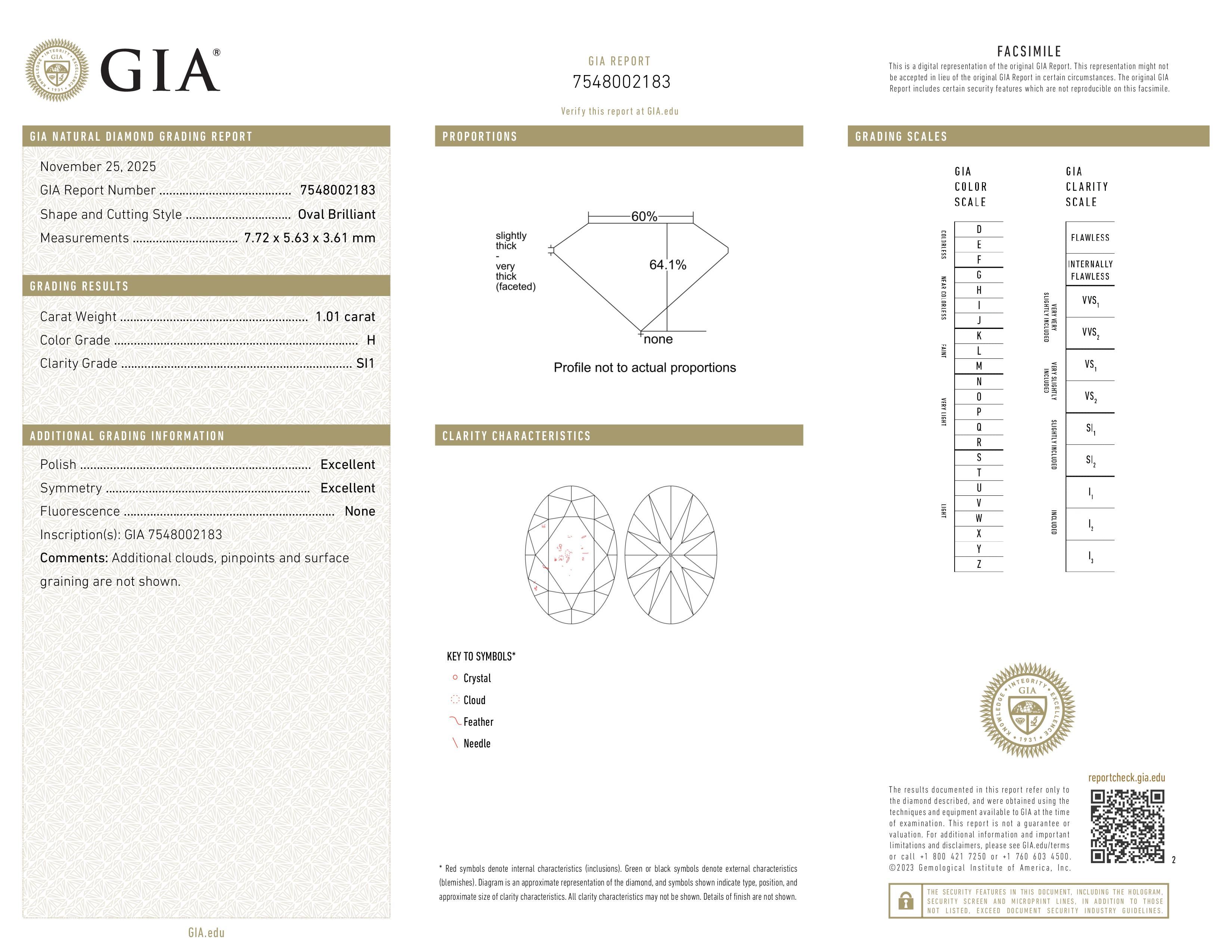 (SI1) This diamond contains few inclusions detectable using 10x magnification. However, when the diamond is set in jewelry, these inclusions are not usually visible to the naked eye. The SI1 graded diamonds are less expensive then higher clarity graded and therefore offer exceptional value for those that want to stay within budget and get a larger diamond. If you're unsure and want our opinion, just let us know and one of our gemologists will review it for you.
