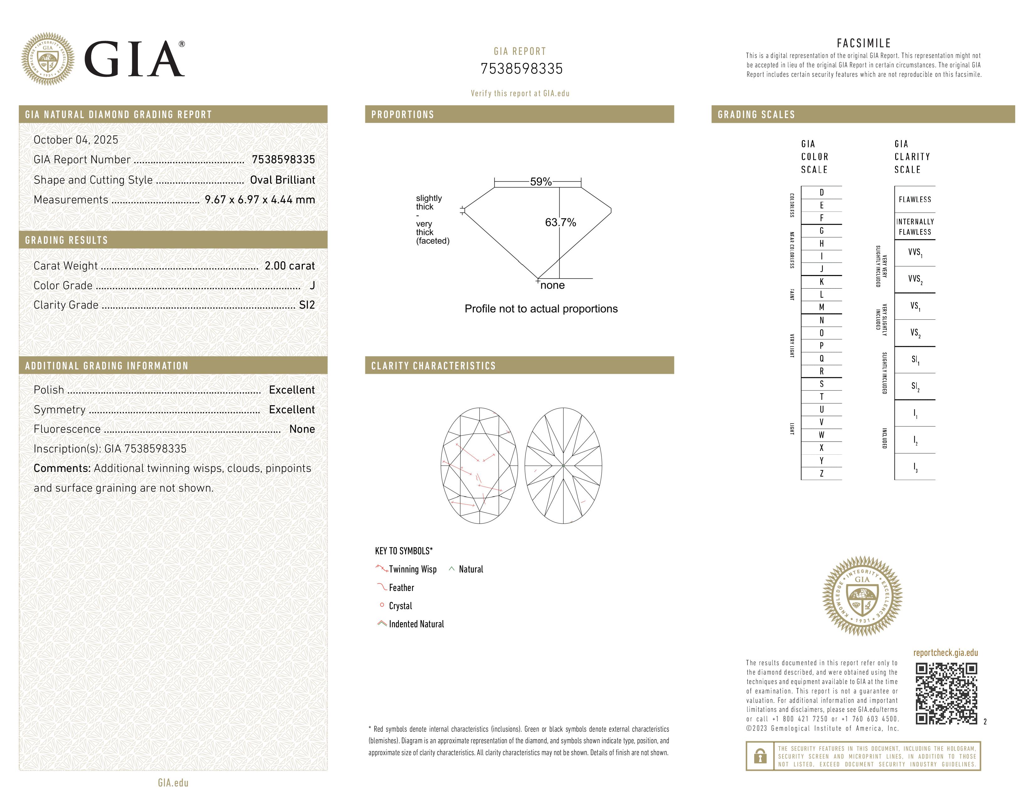 (SI2) Some inclusions are detectable under 10x magnification, even to the untrained eye. However, when the diamond is set in jewelry, these inclusions are not usually visible to the naked eye. The SI2 graded diamonds are less expensive then higher clarity graded and therefore offer exceptional value for those that want to stay within budget and get a larger diamond. If you're unsure and want our opinion, just let us know and one of our gemologists will review it for you.