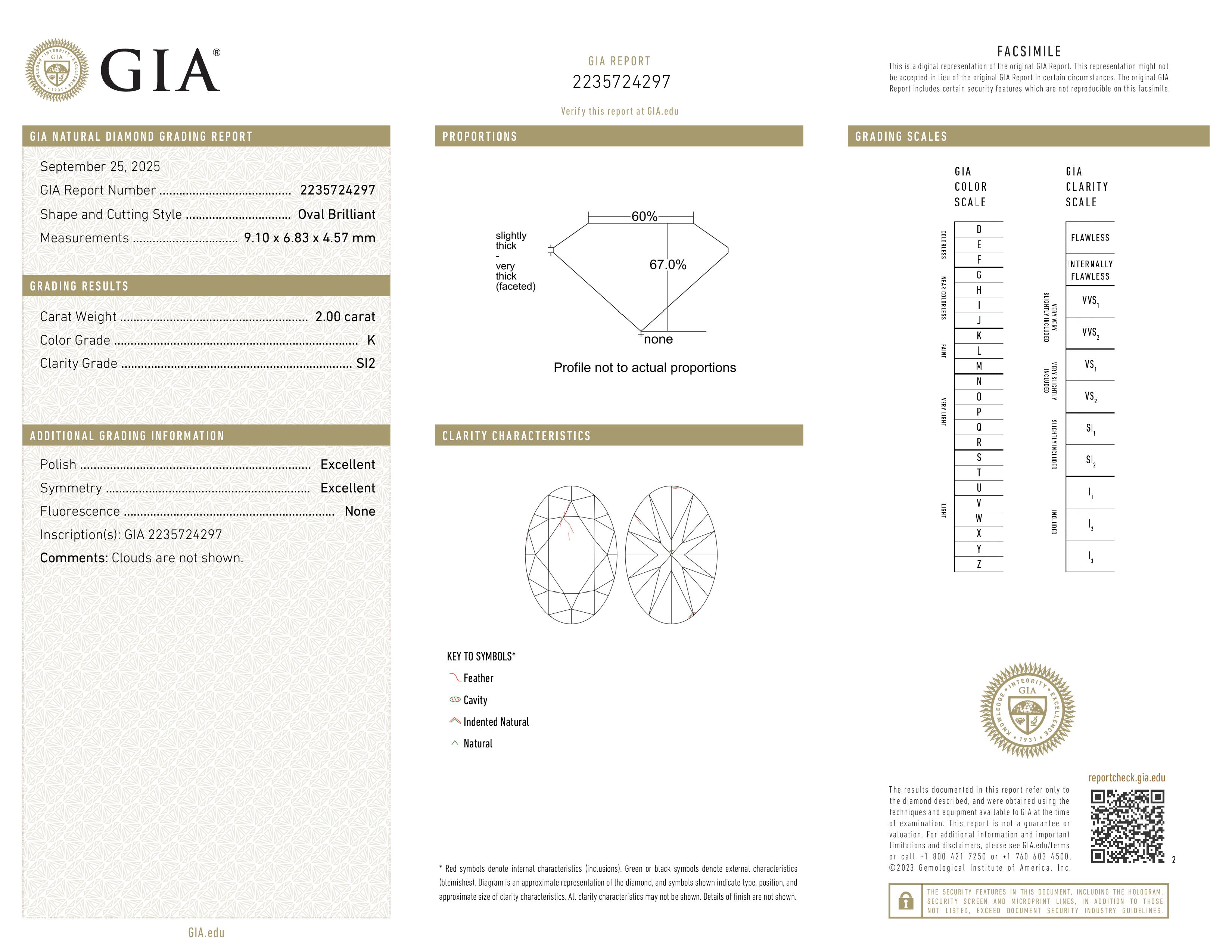 (SI2) Some inclusions are detectable under 10x magnification, even to the untrained eye. However, when the diamond is set in jewelry, these inclusions are not usually visible to the naked eye. The SI2 graded diamonds are less expensive then higher clarity graded and therefore offer exceptional value for those that want to stay within budget and get a larger diamond. If you're unsure and want our opinion, just let us know and one of our gemologists will review it for you.
