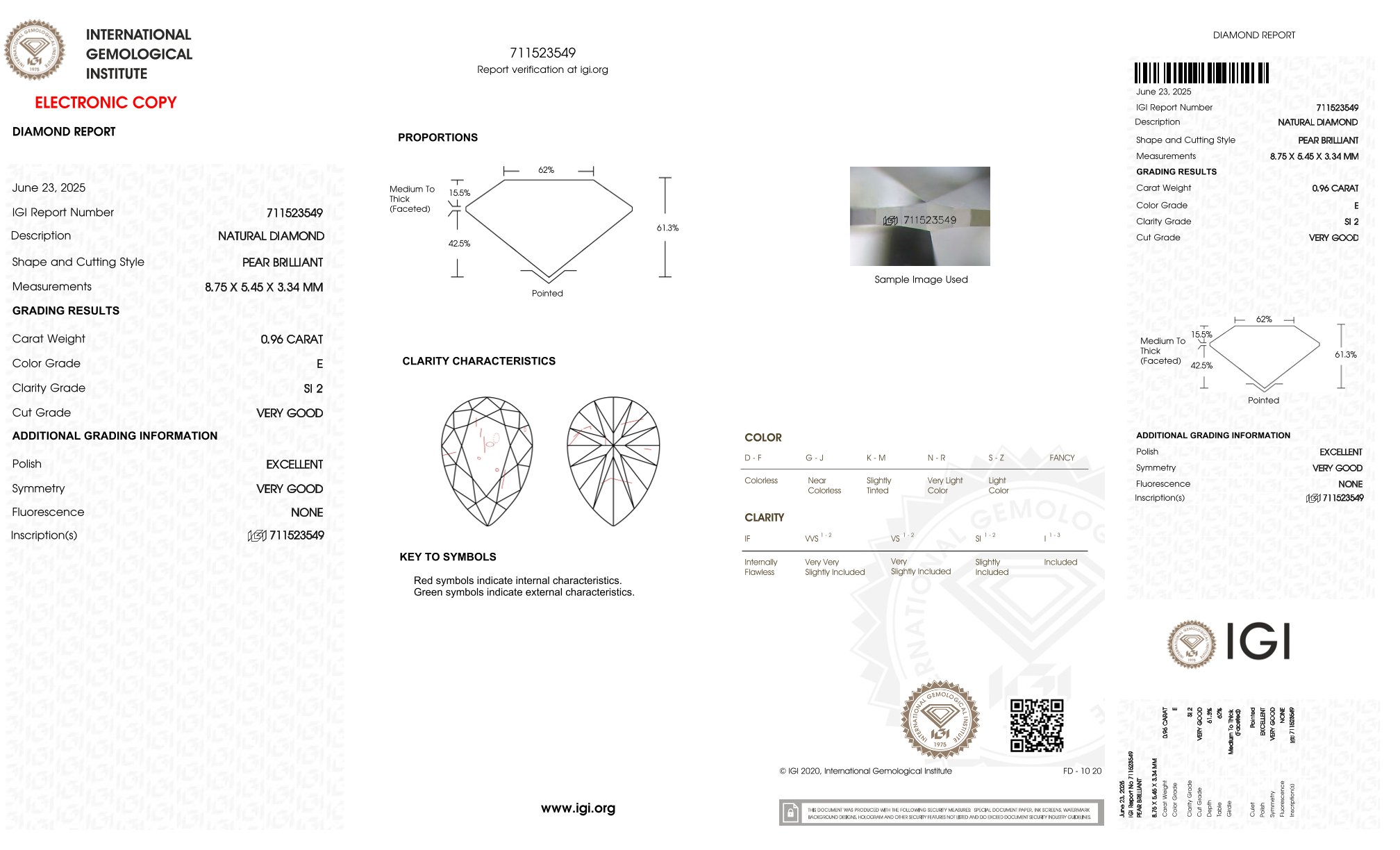 (E) For the untrained eye E-Color is indistinguishable from D and only an expert gemologist using sophisticated equipment and the proper lighting conditions can detect any trace of color. E-Color is considered exceptionally fine and very rare.