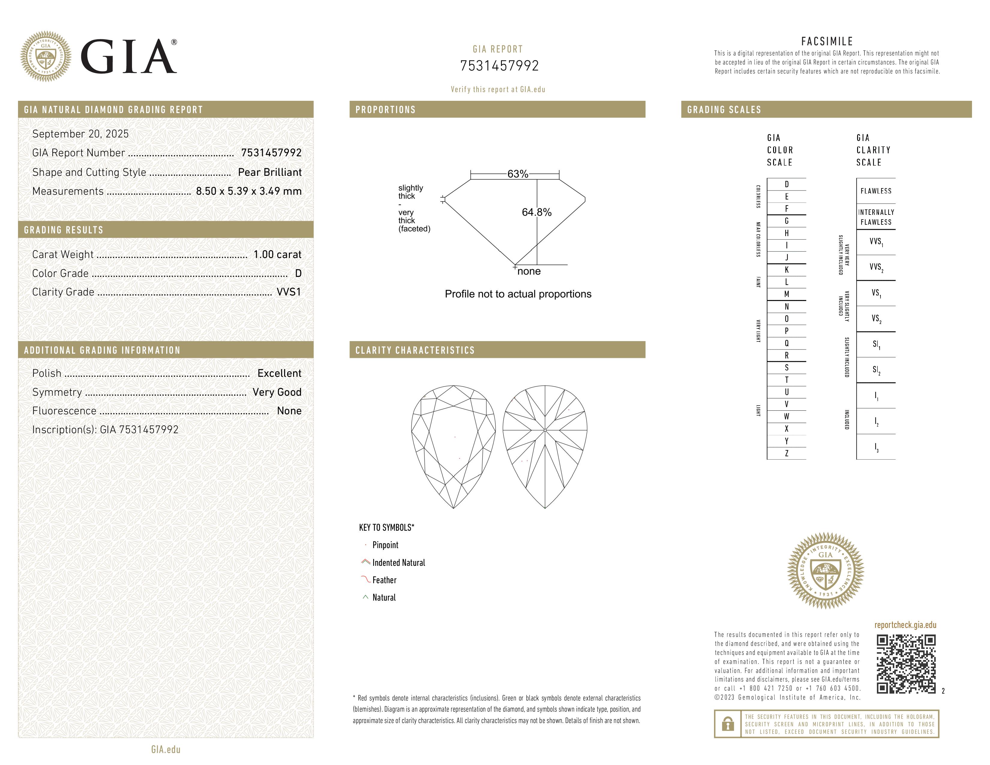(VVS1) This diamond has very, very small inclusions. The minute inclusions are difficult for even a trained grader to see under 30x magnification. VVS1 graded diamonds are very rare.