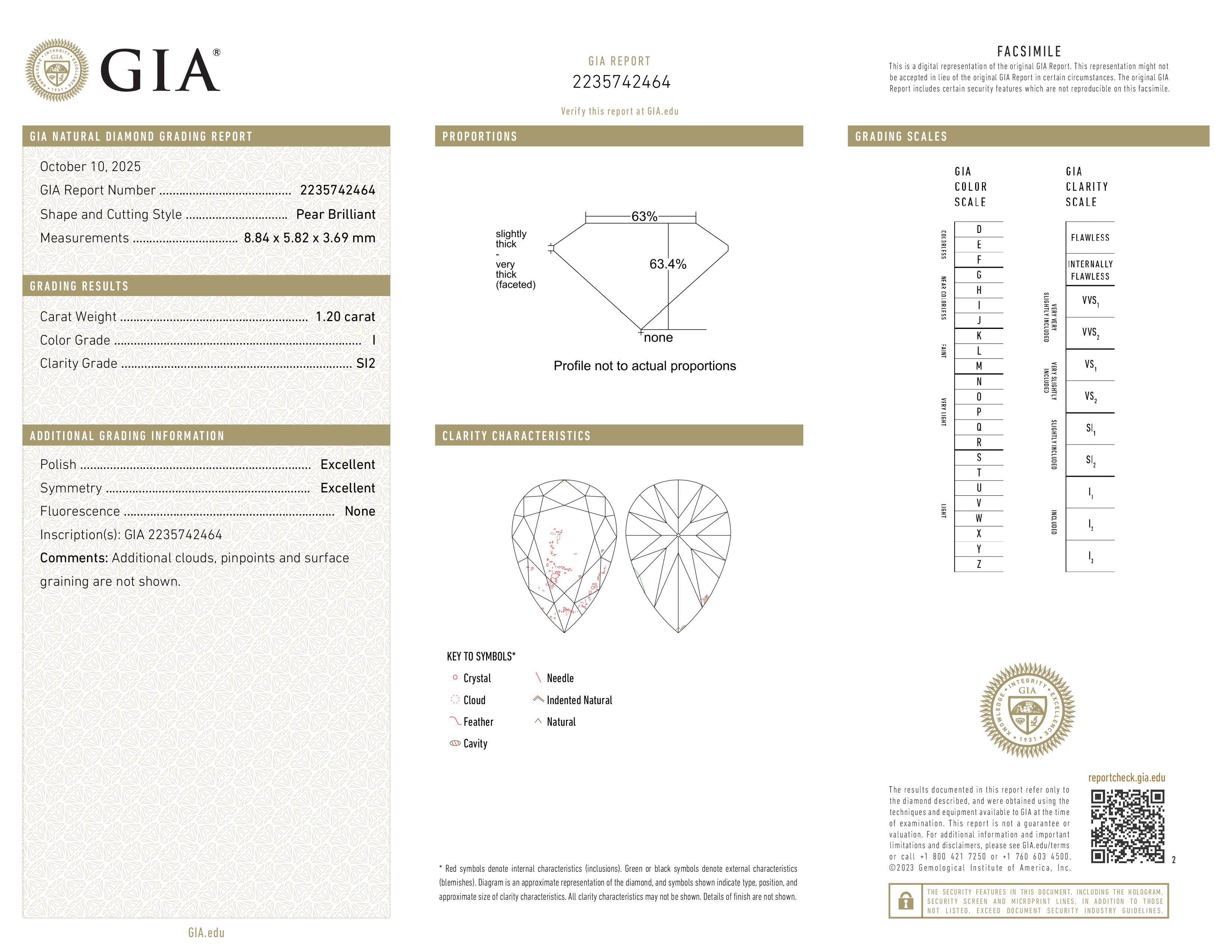 (SI2) Some inclusions are detectable under 10x magnification, even to the untrained eye. However, when the diamond is set in jewelry, these inclusions are not usually visible to the naked eye. The SI2 graded diamonds are less expensive then higher clarity graded and therefore offer exceptional value for those that want to stay within budget and get a larger diamond. If you're unsure and want our opinion, just let us know and one of our gemologists will review it for you.