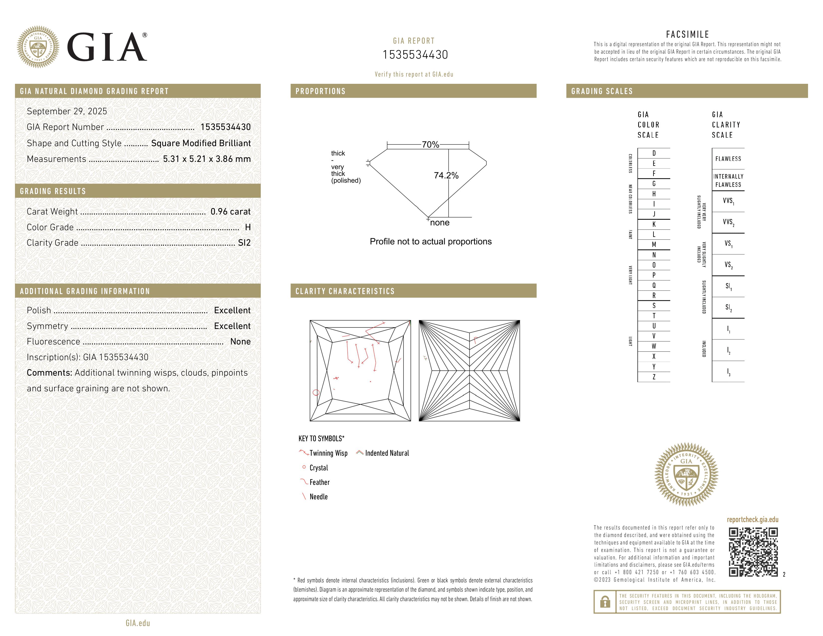 (SI2) Some inclusions are detectable under 10x magnification, even to the untrained eye. However, when the diamond is set in jewelry, these inclusions are not usually visible to the naked eye. The SI2 graded diamonds are less expensive then higher clarity graded and therefore offer exceptional value for those that want to stay within budget and get a larger diamond. If you're unsure and want our opinion, just let us know and one of our gemologists will review it for you.