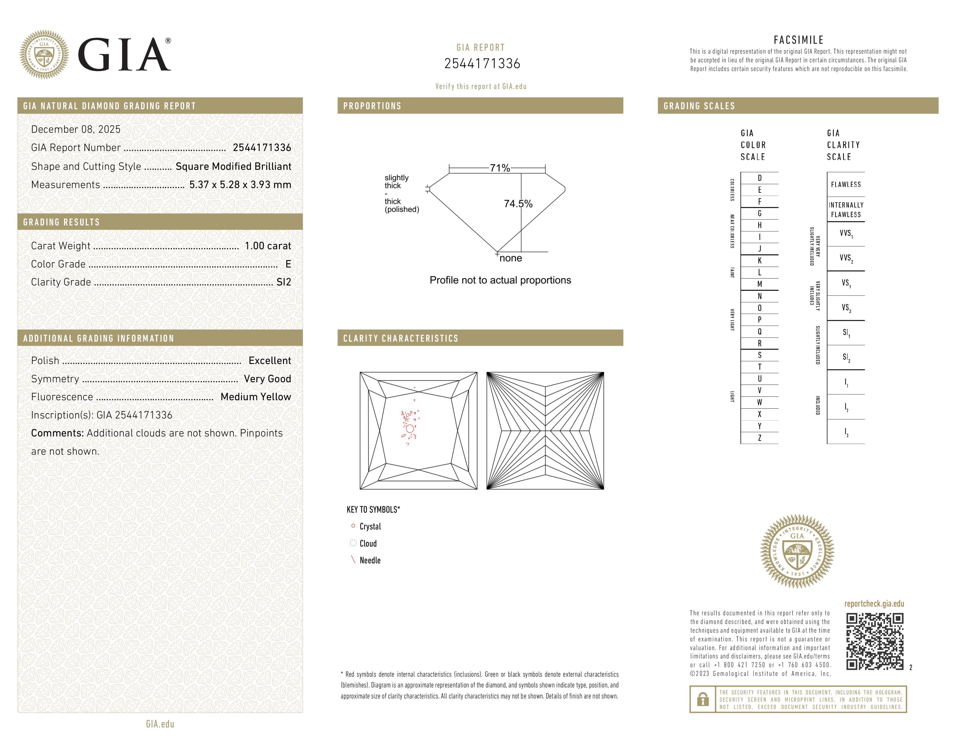 (SI2) Some inclusions are detectable under 10x magnification, even to the untrained eye. However, when the diamond is set in jewelry, these inclusions are not usually visible to the naked eye. The SI2 graded diamonds are less expensive then higher clarity graded and therefore offer exceptional value for those that want to stay within budget and get a larger diamond. If you're unsure and want our opinion, just let us know and one of our gemologists will review it for you.
