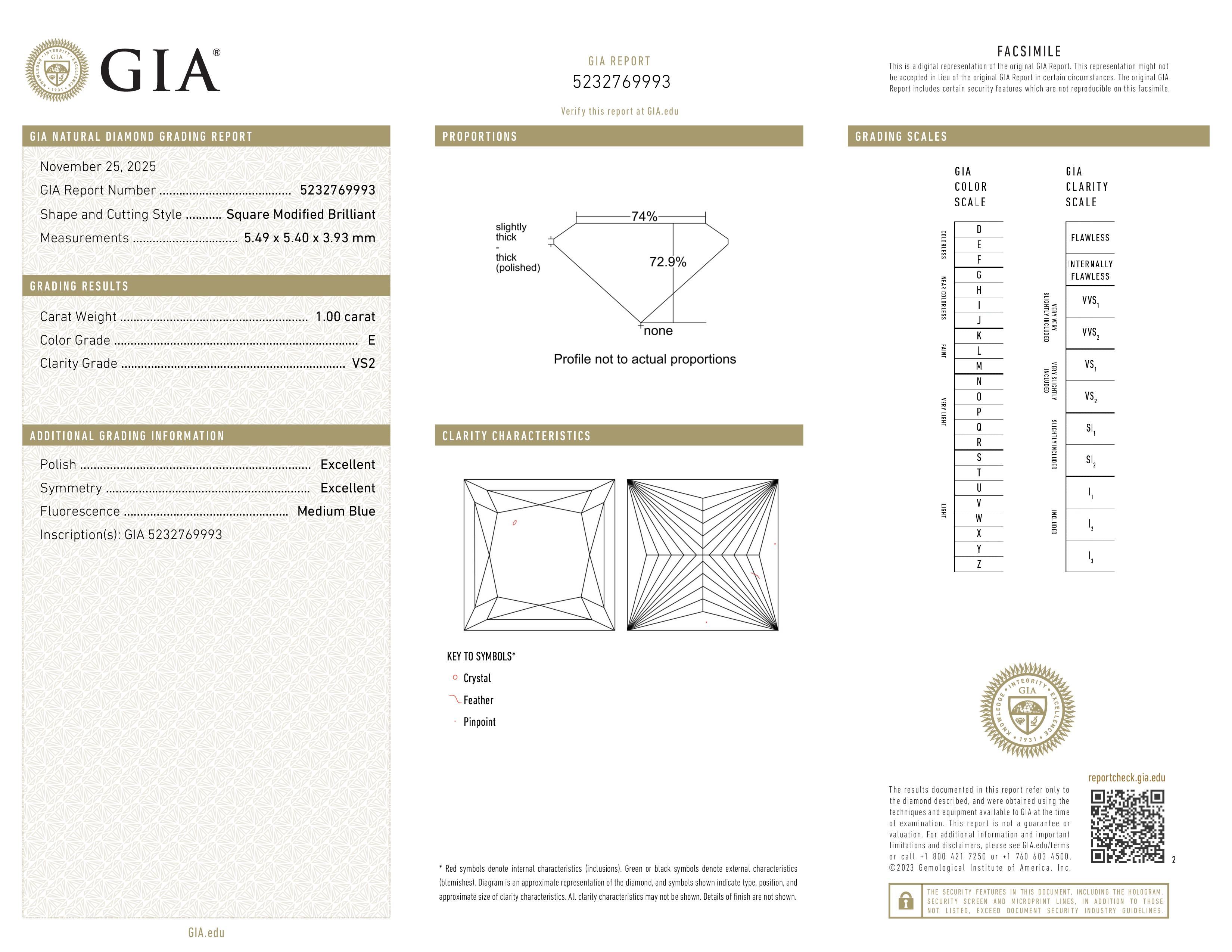 (VS2) Most people find this to be the sweet spot. This diamond contains very, few inclusions that are difficult for the untrained eye to see under 10x magnification. VS2 diamonds have no visible blemishes and are less expensive than higher clarity grades, therefore offering exceptional value while not compromising on quality.