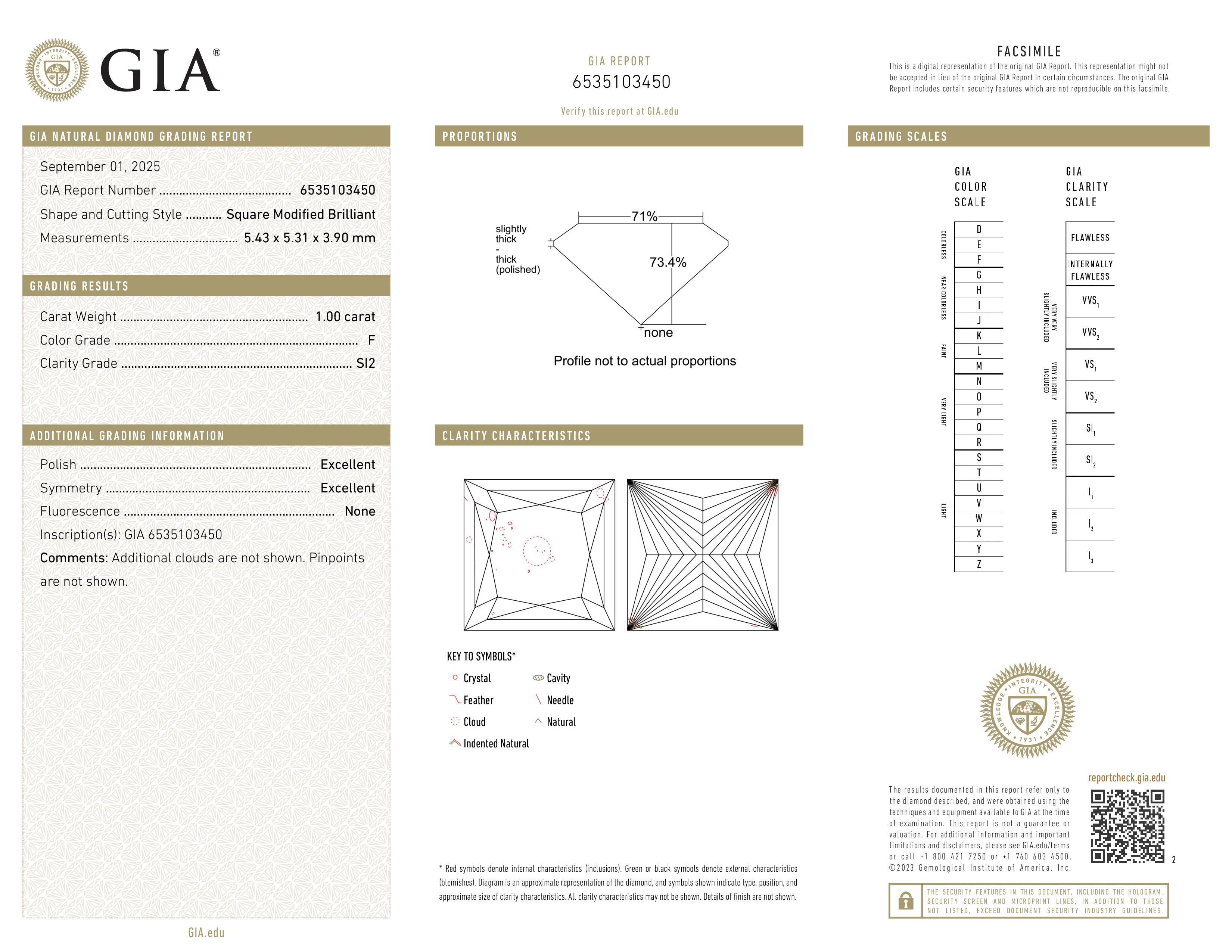 (SI2) Some inclusions are detectable under 10x magnification, even to the untrained eye. However, when the diamond is set in jewelry, these inclusions are not usually visible to the naked eye. The SI2 graded diamonds are less expensive then higher clarity graded and therefore offer exceptional value for those that want to stay within budget and get a larger diamond. If you're unsure and want our opinion, just let us know and one of our gemologists will review it for you.