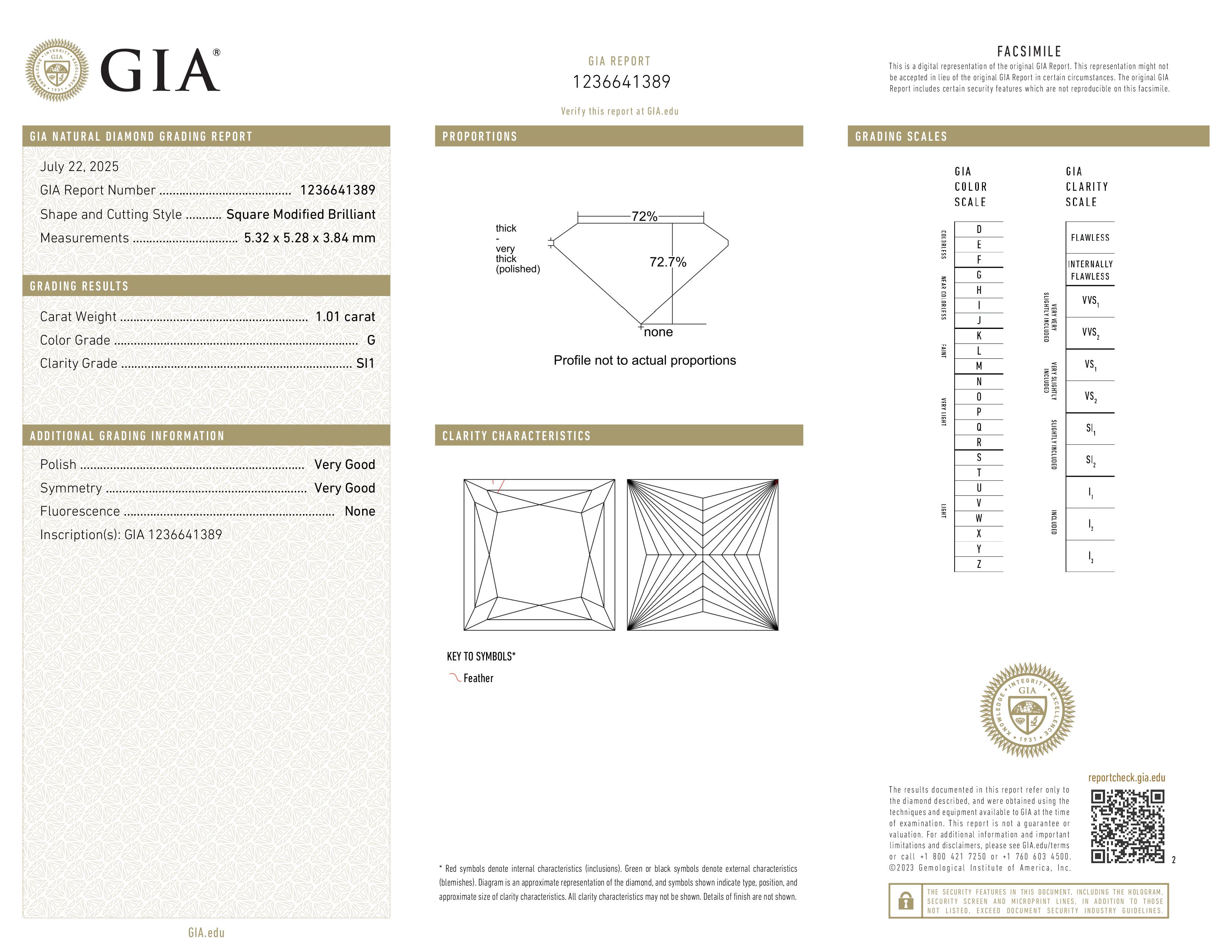 (SI1) This diamond contains few inclusions detectable using 10x magnification. However, when the diamond is set in jewelry, these inclusions are not usually visible to the naked eye. The SI1 graded diamonds are less expensive then higher clarity graded and therefore offer exceptional value for those that want to stay within budget and get a larger diamond. If you're unsure and want our opinion, just let us know and one of our gemologists will review it for you.