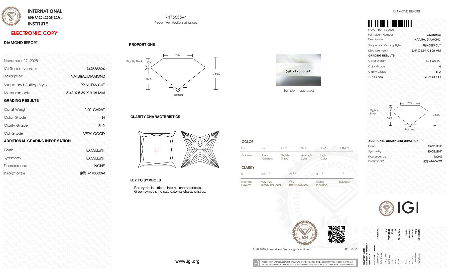 (Excellent) This diamond is cut to the highest standards determined by grading laboratories. Reflecting virtually all the light that enters, this diamond was cut to maximize brilliance and sparkle. Excellent cuts are exceptionally fine and rare and have ideal proportions and finish characteristics.