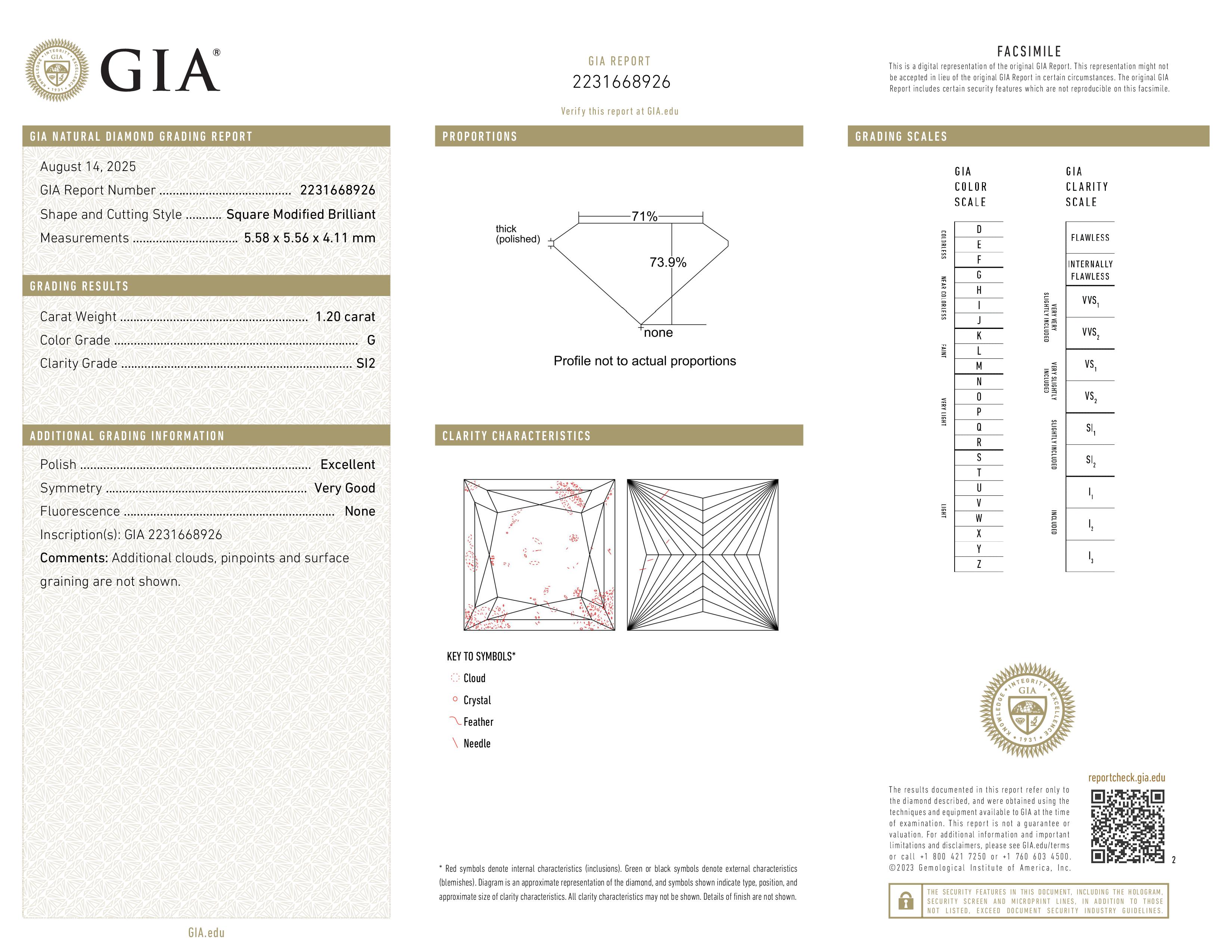 (SI2) Some inclusions are detectable under 10x magnification, even to the untrained eye. However, when the diamond is set in jewelry, these inclusions are not usually visible to the naked eye. The SI2 graded diamonds are less expensive then higher clarity graded and therefore offer exceptional value for those that want to stay within budget and get a larger diamond. If you're unsure and want our opinion, just let us know and one of our gemologists will review it for you.