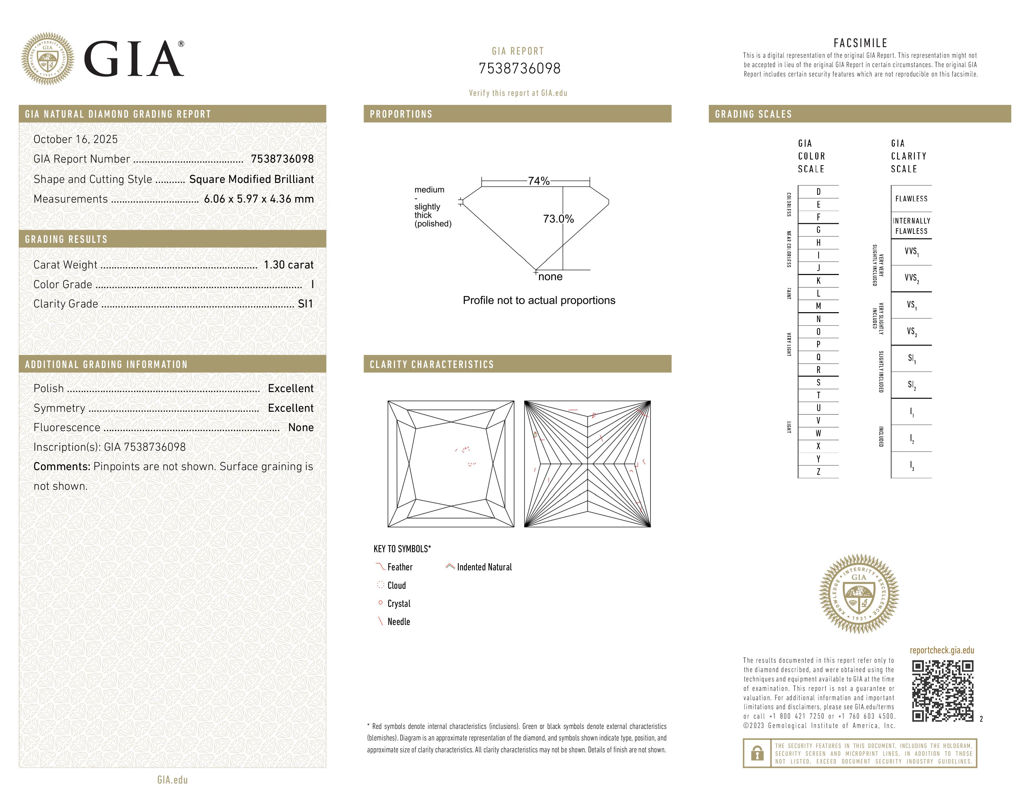 (SI1) This diamond contains few inclusions detectable using 10x magnification. However, when the diamond is set in jewelry, these inclusions are not usually visible to the naked eye. The SI1 graded diamonds are less expensive then higher clarity graded and therefore offer exceptional value for those that want to stay within budget and get a larger diamond. If you're unsure and want our opinion, just let us know and one of our gemologists will review it for you.