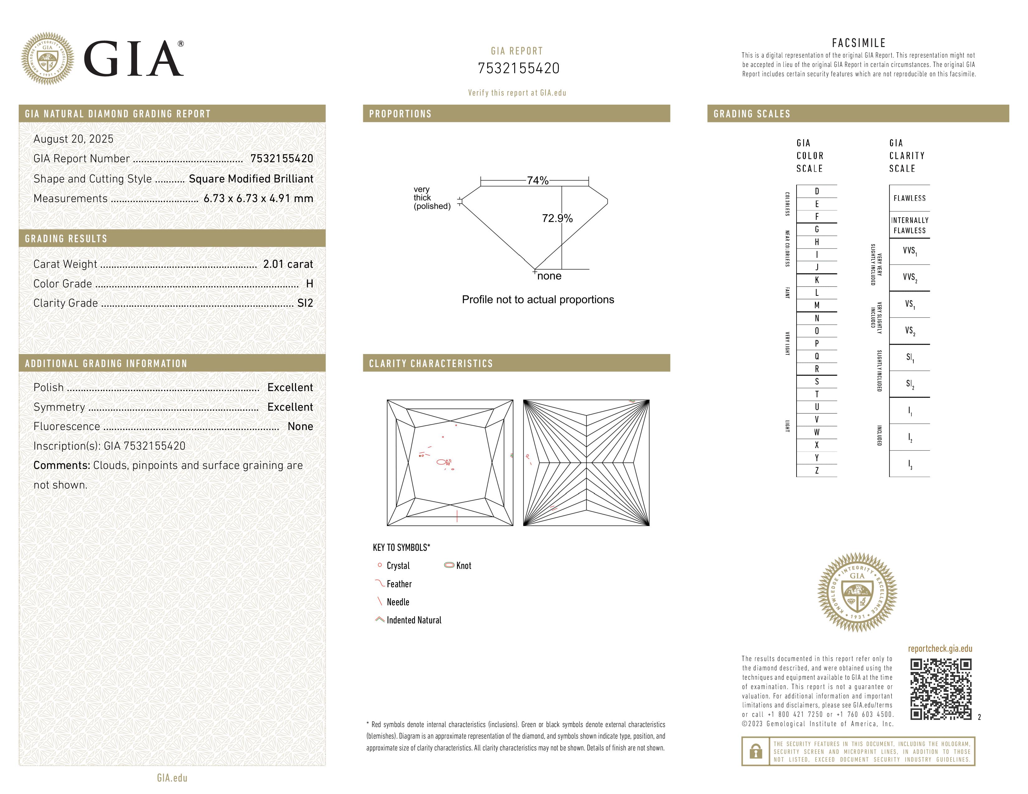 (SI2) Some inclusions are detectable under 10x magnification, even to the untrained eye. However, when the diamond is set in jewelry, these inclusions are not usually visible to the naked eye. The SI2 graded diamonds are less expensive then higher clarity graded and therefore offer exceptional value for those that want to stay within budget and get a larger diamond. If you're unsure and want our opinion, just let us know and one of our gemologists will review it for you.