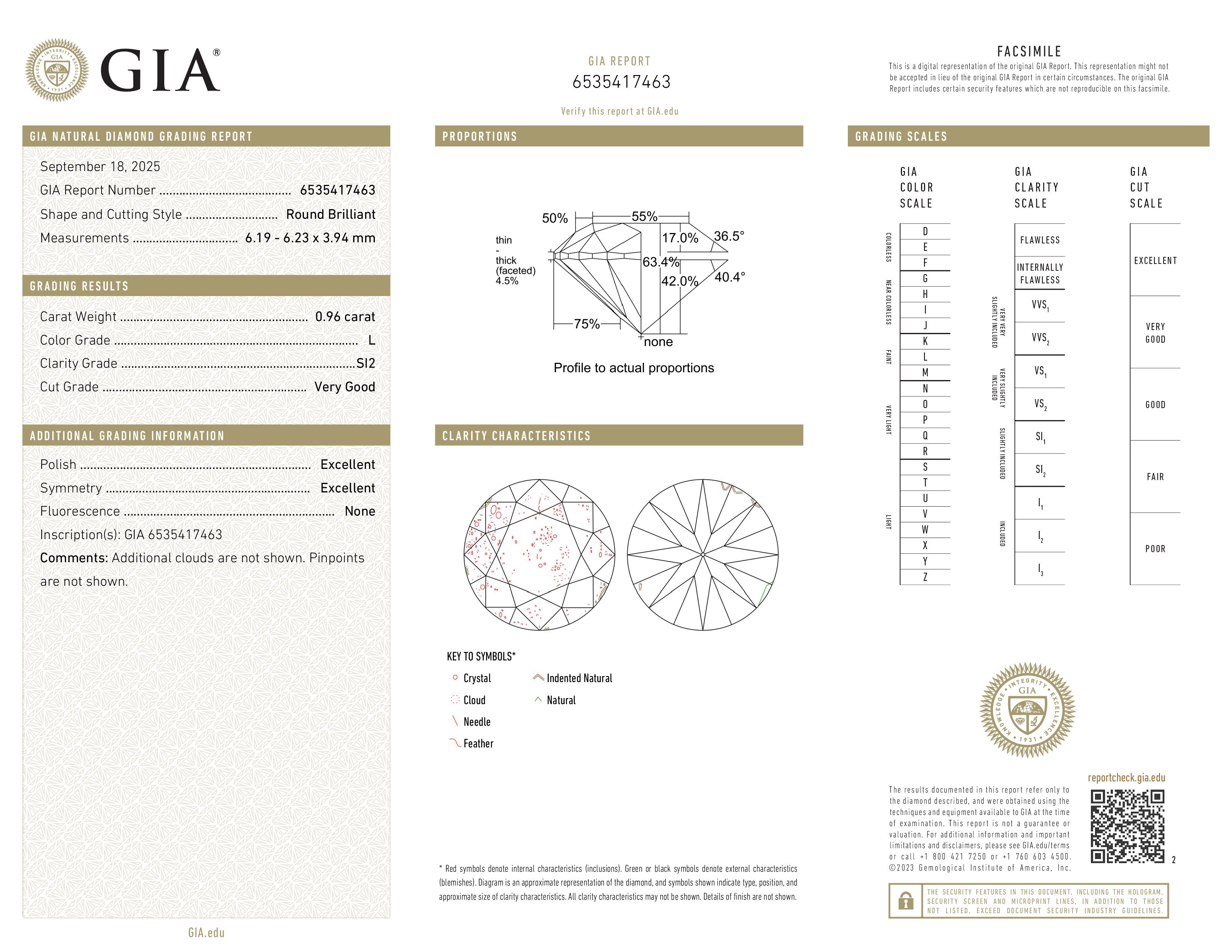 (L) This diamond is graded L Color which lies in the faint yellow family. It is under color grades of diamonds labeled D through K and above color grades of diamonds labeled M through Z. The yellow tint is detectable when the stone is viewed loose; however a yellow gold setting can minimize the color appearance of the diamond significantly. Although this diamond does not fall into the near-colorless family, it is still a desirable stone.