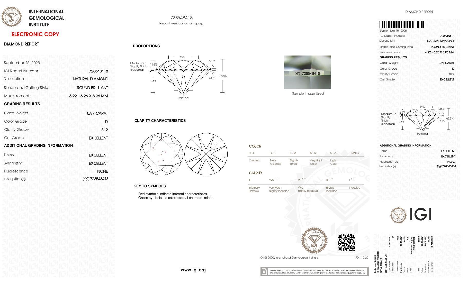 (Excellent) This diamond is cut to the highest standards determined by grading laboratories. Reflecting virtually all the light that enters, this diamond was cut to maximize brilliance and sparkle. Excellent cuts are exceptionally fine and rare and have ideal proportions and finish characteristics.