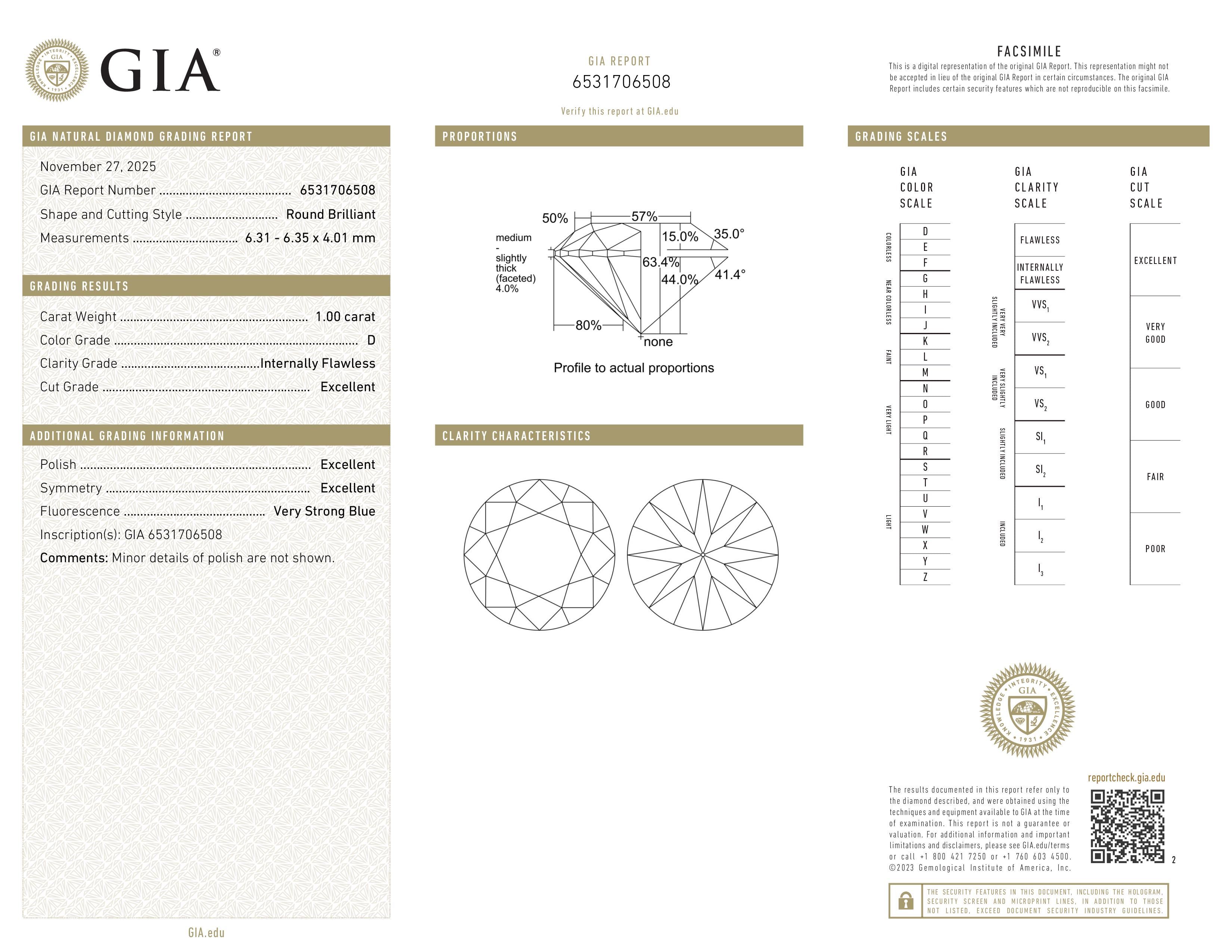 (Excellent) This diamond is cut to the highest standards determined by grading laboratories. Reflecting virtually all the light that enters, this diamond was cut to maximize brilliance and sparkle. Excellent cuts are exceptionally fine and rare and have ideal proportions and finish characteristics.