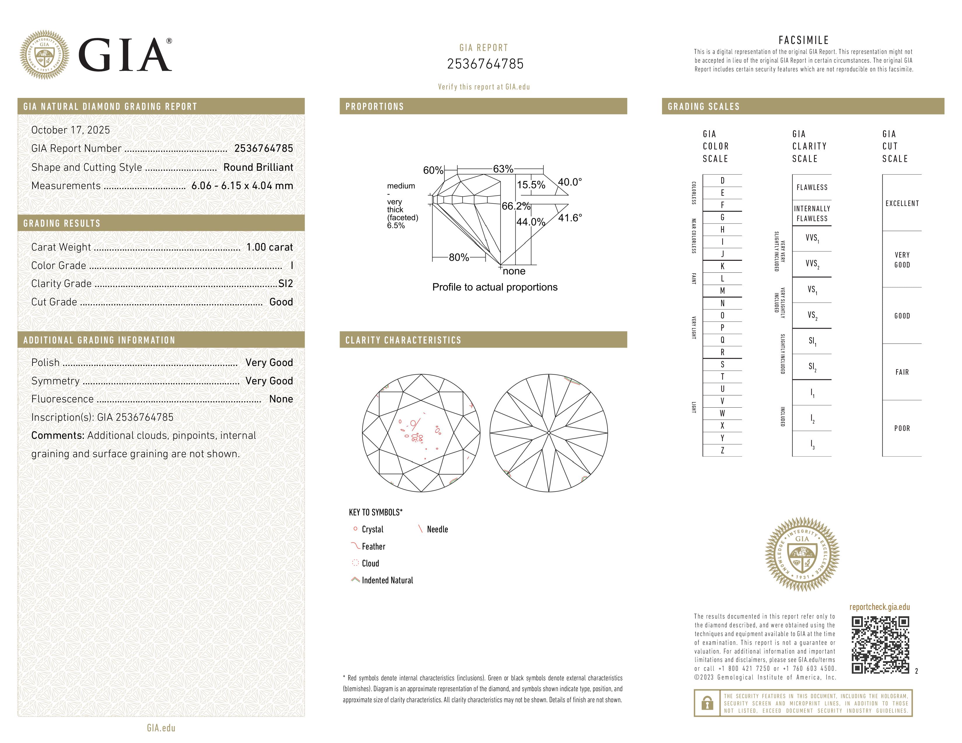 (SI2) Some inclusions are detectable under 10x magnification, even to the untrained eye. However, when the diamond is set in jewelry, these inclusions are not usually visible to the naked eye. The SI2 graded diamonds are less expensive then higher clarity graded and therefore offer exceptional value for those that want to stay within budget and get a larger diamond. If you're unsure and want our opinion, just let us know and one of our gemologists will review it for you.