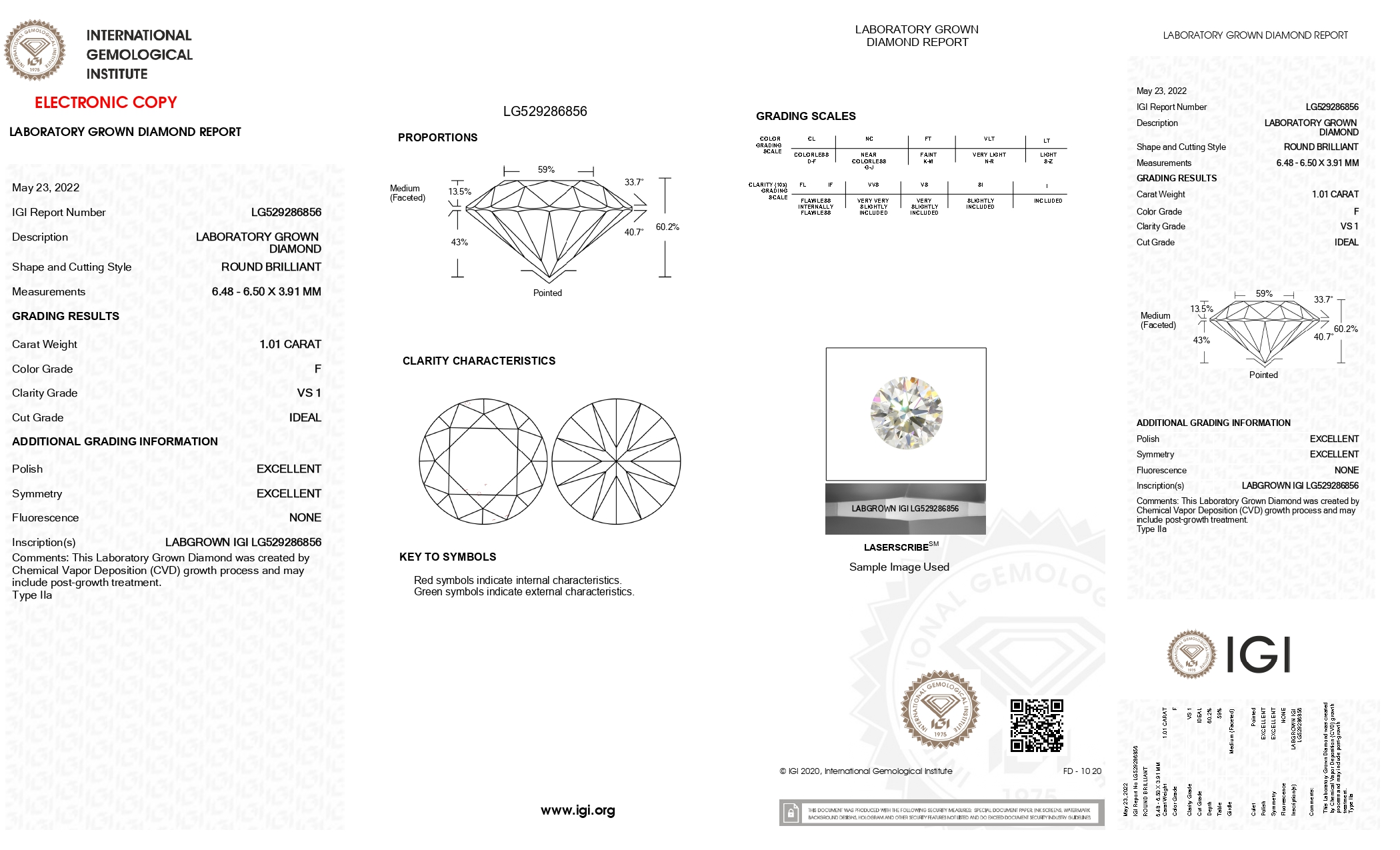 (VS1) This diamond contains very, few inclusions that are difficult for the untrained eye to see under 10x magnification. VS1 diamonds have no visible blemishes and are less expensive than higher clarity grades, therefore offering exceptional value while not compromising on quality.