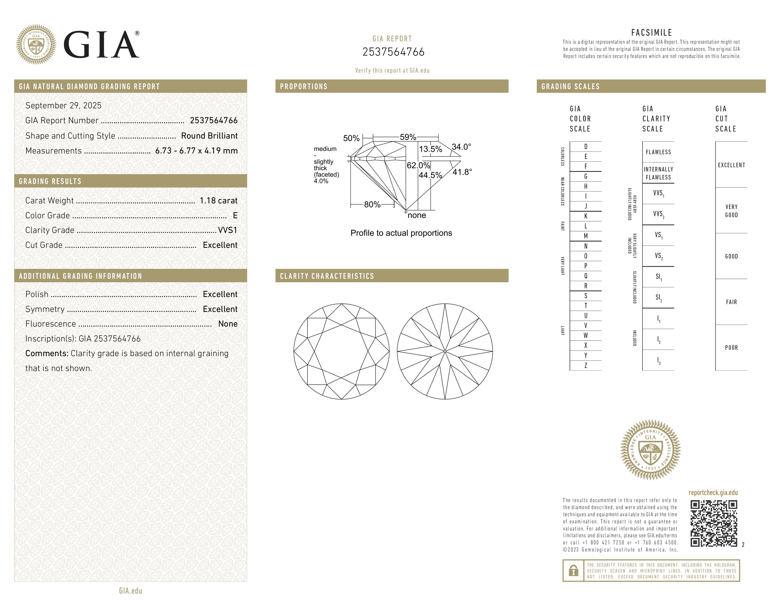 (VVS1) This diamond has very, very small inclusions. The minute inclusions are difficult for even a trained grader to see under 30x magnification. VVS1 graded diamonds are very rare.