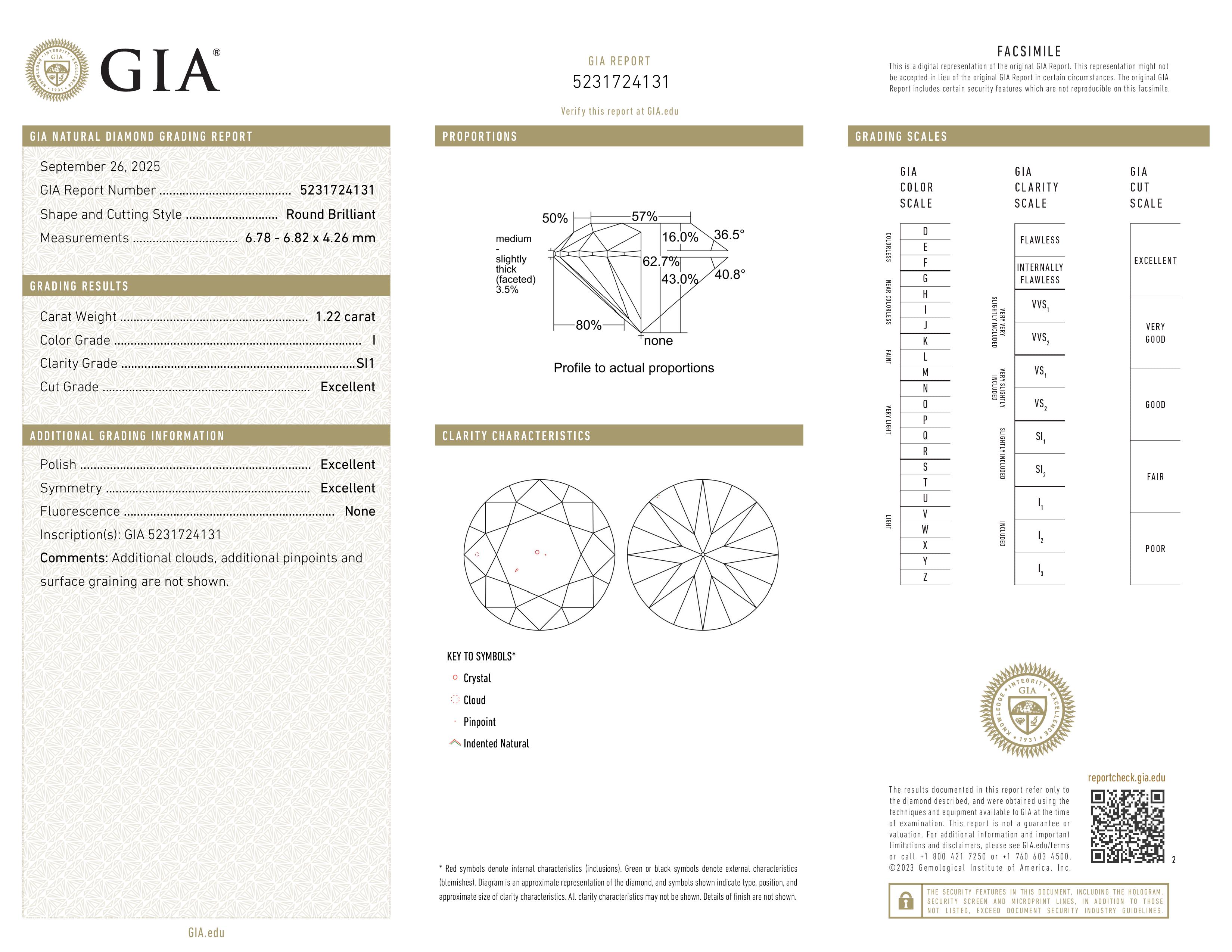 (SI1) This diamond contains few inclusions detectable using 10x magnification. However, when the diamond is set in jewelry, these inclusions are not usually visible to the naked eye. The SI1 graded diamonds are less expensive then higher clarity graded and therefore offer exceptional value for those that want to stay within budget and get a larger diamond. If you're unsure and want our opinion, just let us know and one of our gemologists will review it for you.