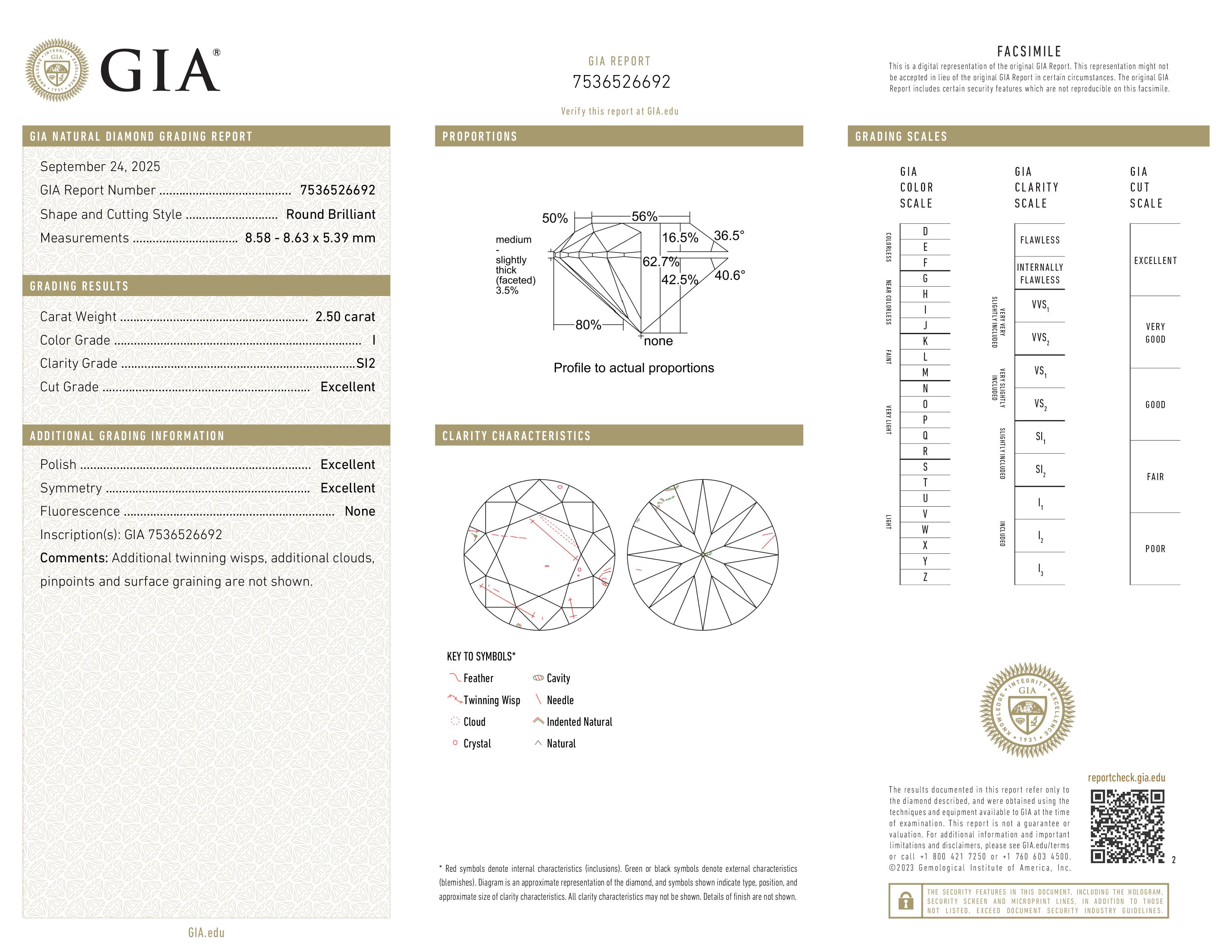 (SI2) Some inclusions are detectable under 10x magnification, even to the untrained eye. However, when the diamond is set in jewelry, these inclusions are not usually visible to the naked eye. The SI2 graded diamonds are less expensive then higher clarity graded and therefore offer exceptional value for those that want to stay within budget and get a larger diamond. If you're unsure and want our opinion, just let us know and one of our gemologists will review it for you.