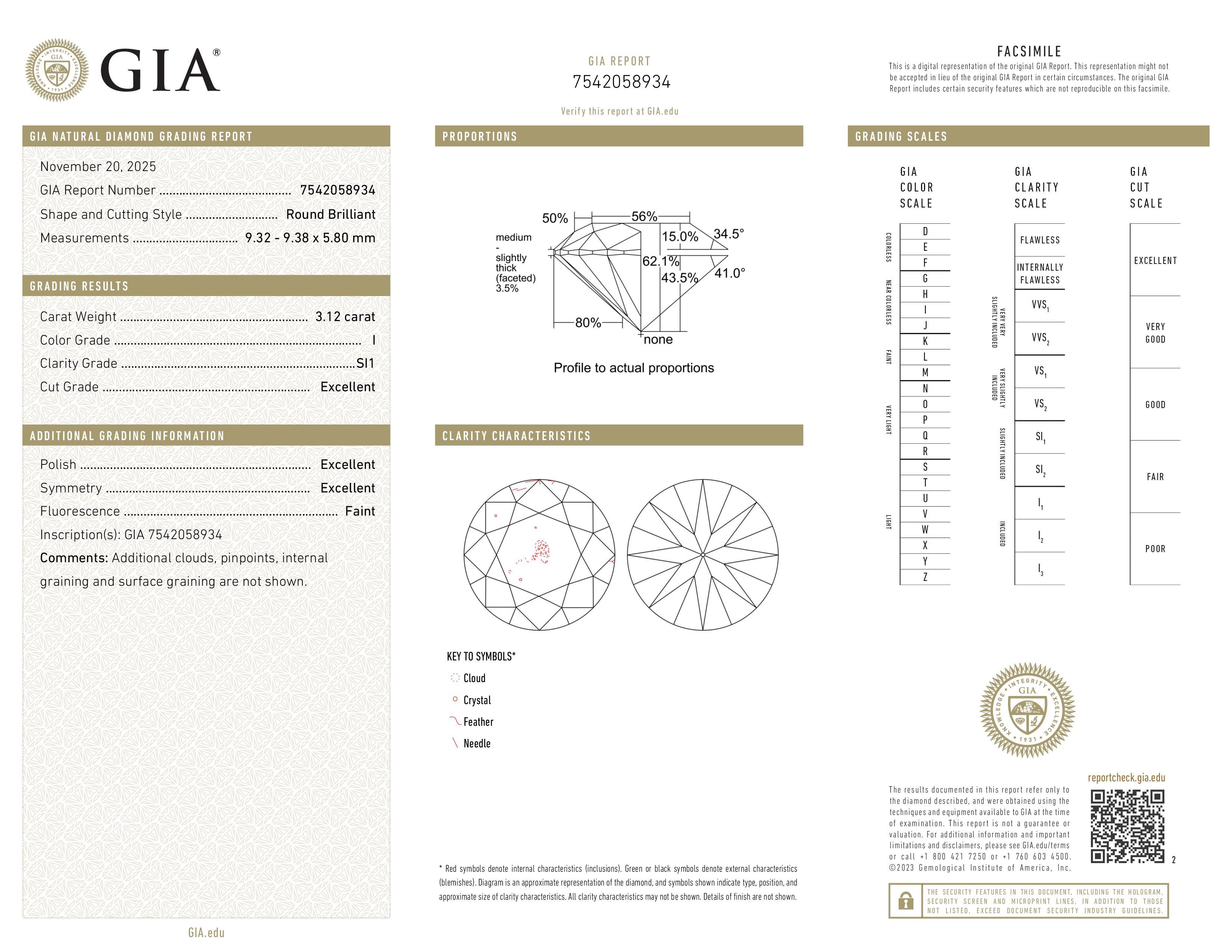 (SI1) This diamond contains few inclusions detectable using 10x magnification. However, when the diamond is set in jewelry, these inclusions are not usually visible to the naked eye. The SI1 graded diamonds are less expensive then higher clarity graded and therefore offer exceptional value for those that want to stay within budget and get a larger diamond. If you're unsure and want our opinion, just let us know and one of our gemologists will review it for you.