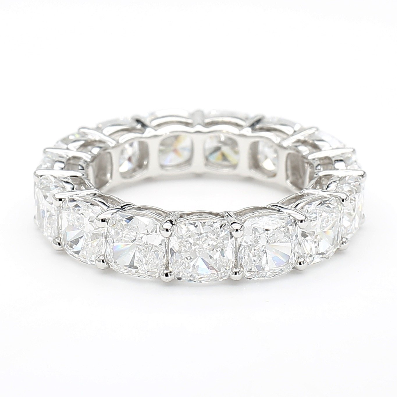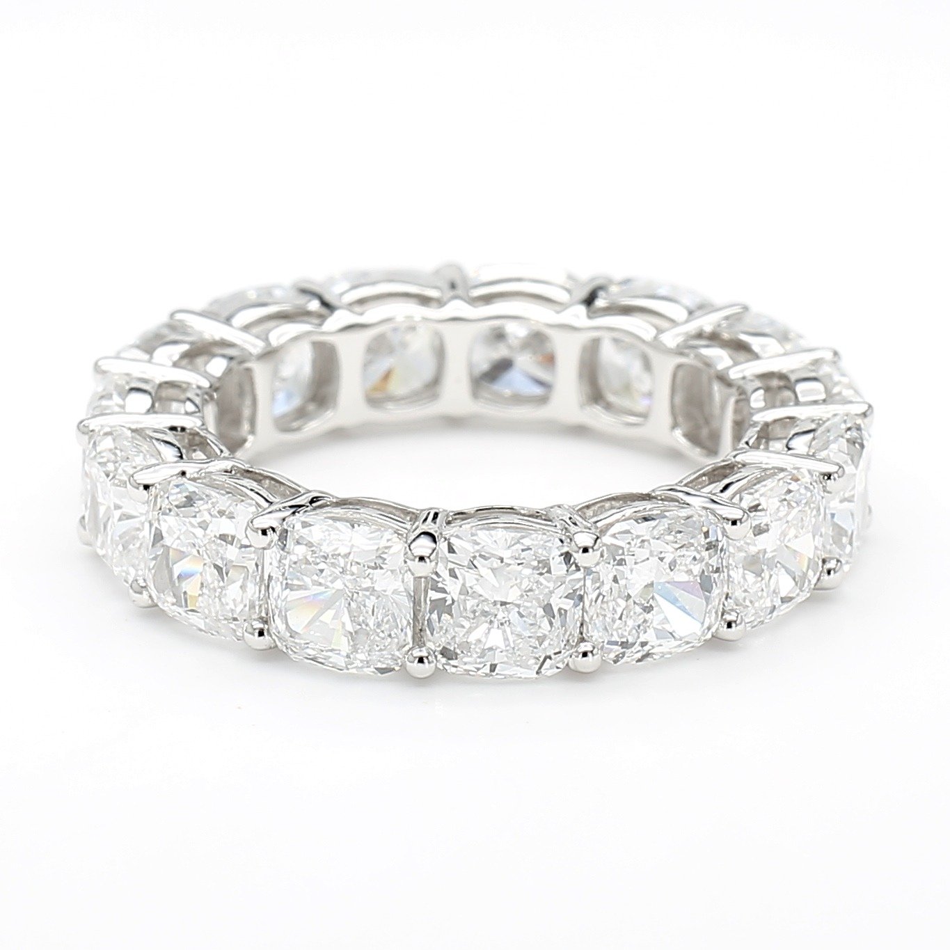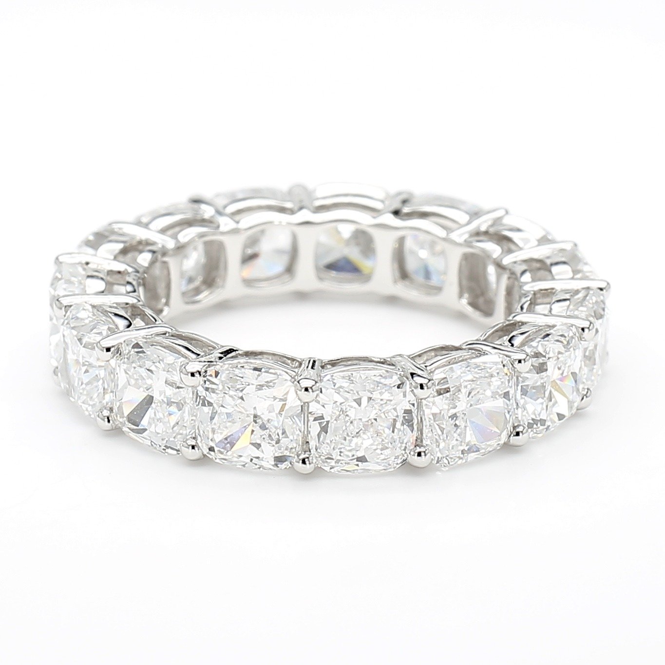 This 9 carat cushion diamond eternity ring features a continuous row of matched cushion-cut diamonds, totaling approximately 9 carats. Each diamond is set in a four-prong basket, maximizing visibility and light return. The stones are evenly spaced and aligned for a symmetrical, uniform look. Crafted in polished white metal, the band offers full circle finger coverage with minimal metal between stones, emphasizing the size and shape of each cushion cut.