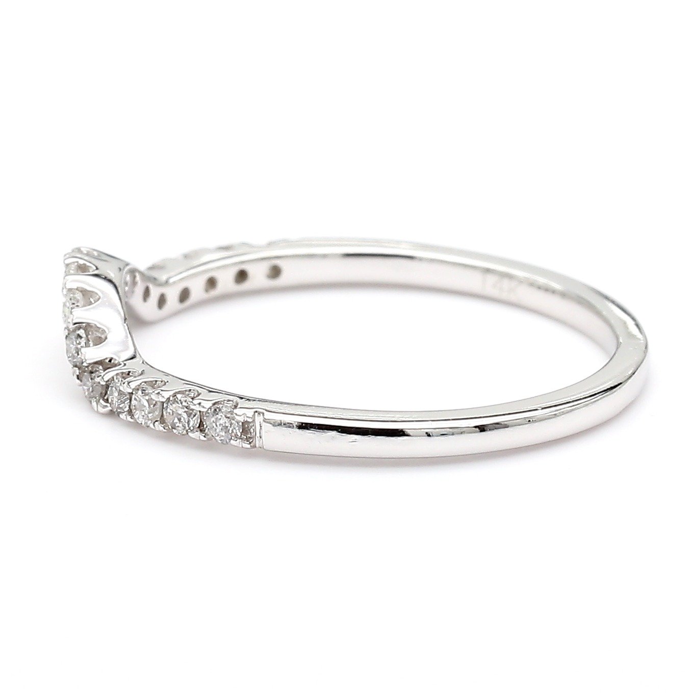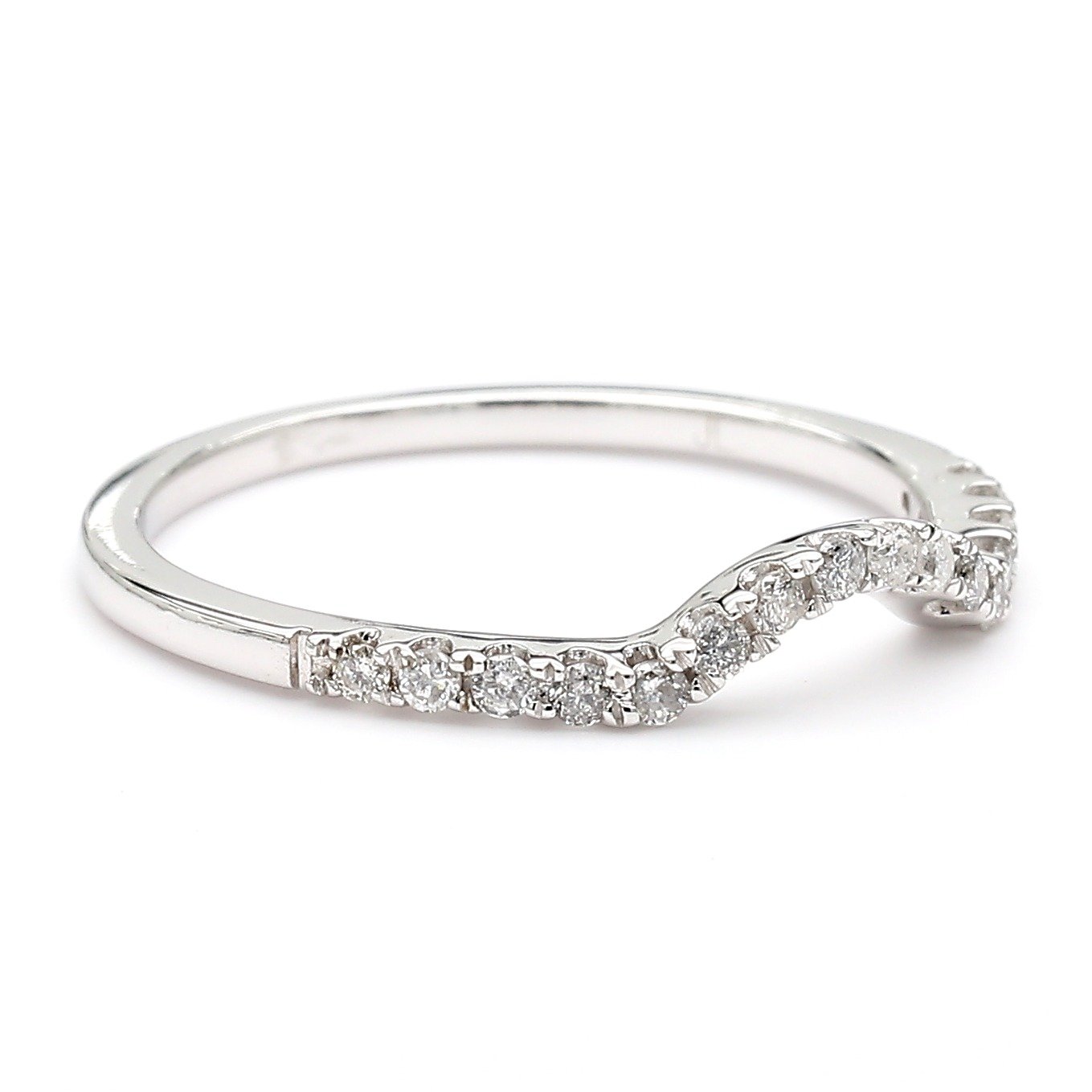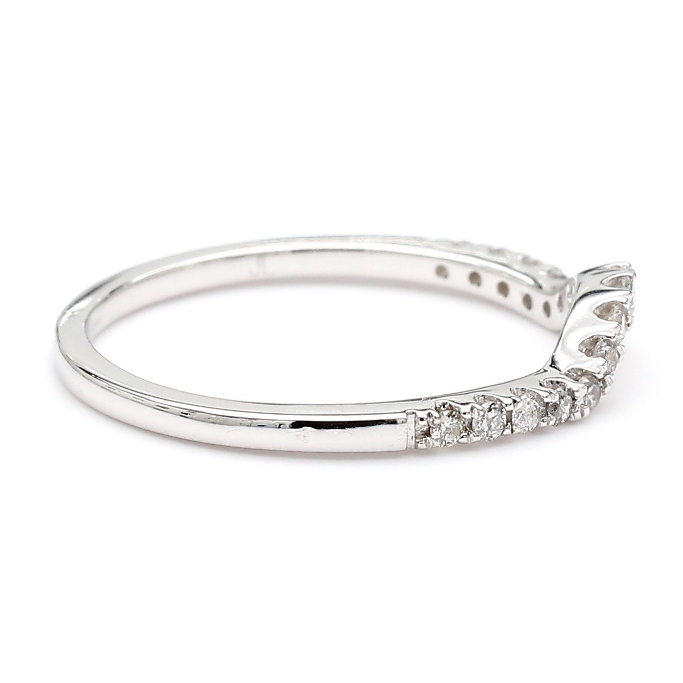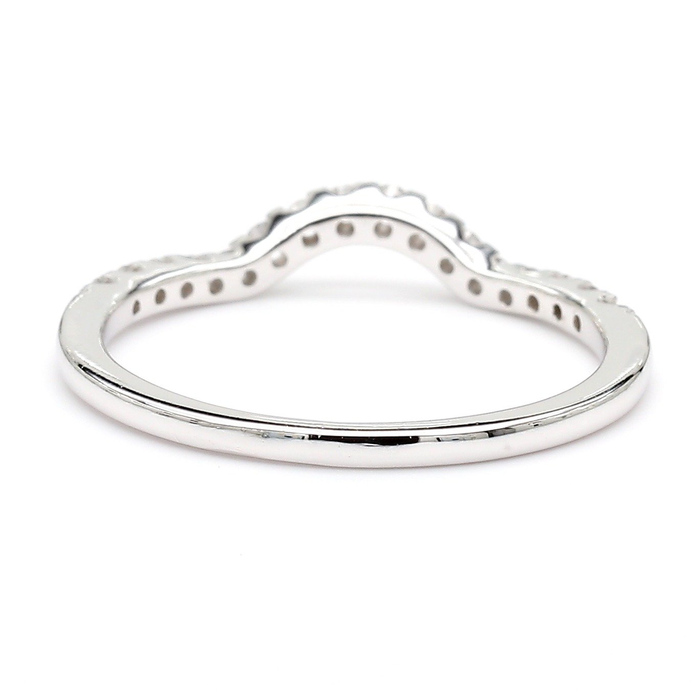 The Elara Curve Diamond Band is a delicate and sophisticated wedding band, designed to gracefully complement an engagement ring or be worn as a standalone statement of elegance. Crafted in lustrous white gold or platinum, the band features a subtle curved silhouette, allowing for a seamless fit alongside other rings. A row of sparkling round-cut diamonds is meticulously set along the curve in a shared-prong setting, enhancing its brilliance while maintaining a refined and timeless look. The gentle contour of the Elara Curve Diamond Band symbolizes harmony and unity, making it a perfect choice for those who appreciate understated luxury with a celestial touch.