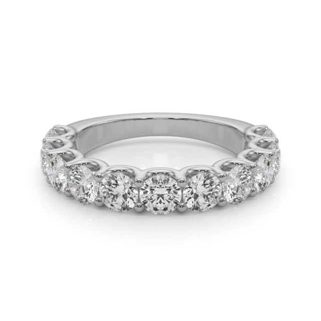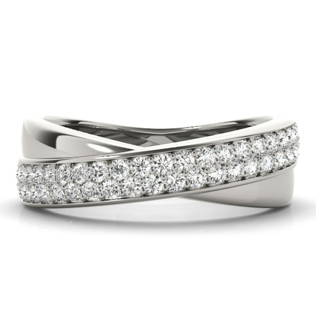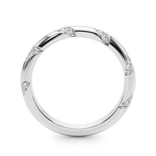 The Eloise matching wedding band features a sleek, polished band adorned with diagonally set diamond clusters. Each section is precisely pavé-set with round brilliant-cut diamonds, creating a striking pattern of alternating sparkle and smooth metal. The design offers a modern twist on classic elegance, perfectly complementing the Elina engagement ring. Crafted for comfort and visual harmony, this band is available in your choice of precious metals.