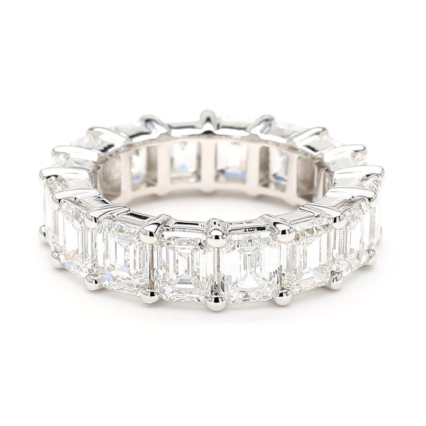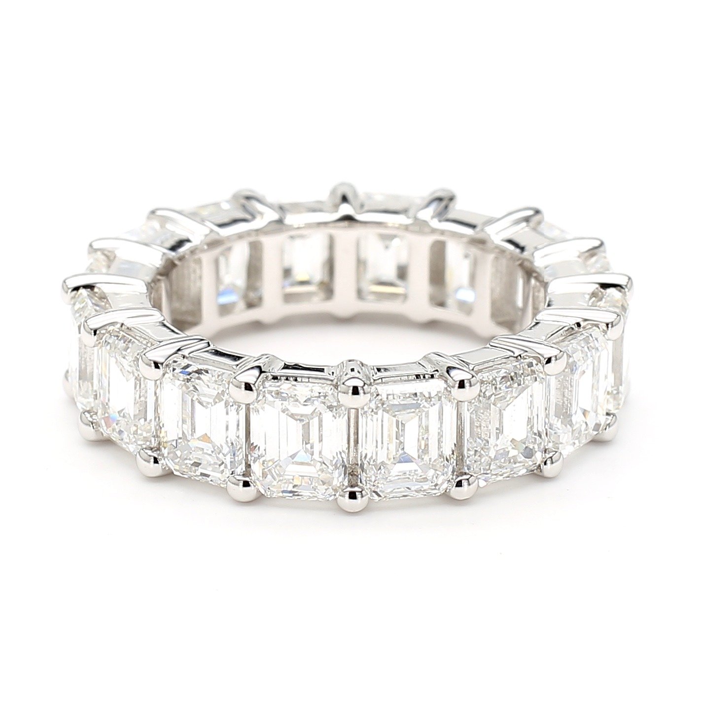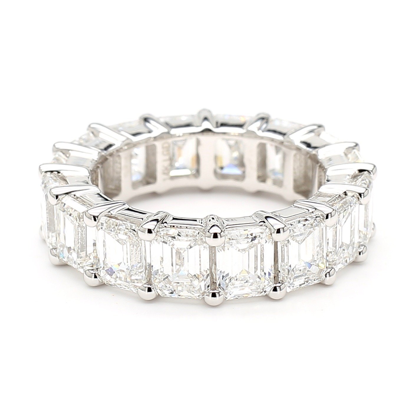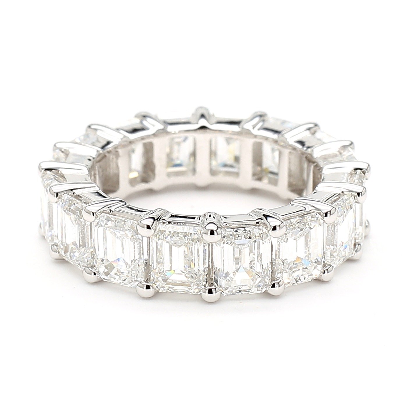 This breathtaking eternity band showcases a seamless circle of perfectly matched emerald-cut diamonds, each meticulously set in a four-prong setting to maximize brilliance while highlighting the clean, elegant lines of the step-cut. Crafted in high-polish platinum (or white gold), the design exudes sophistication and timeless glamour. With its continuous row of striking emerald cuts, the ring symbolizes everlasting love and makes a bold statement—whether worn as a wedding band, anniversary ring, or a luxurious standalone piece.