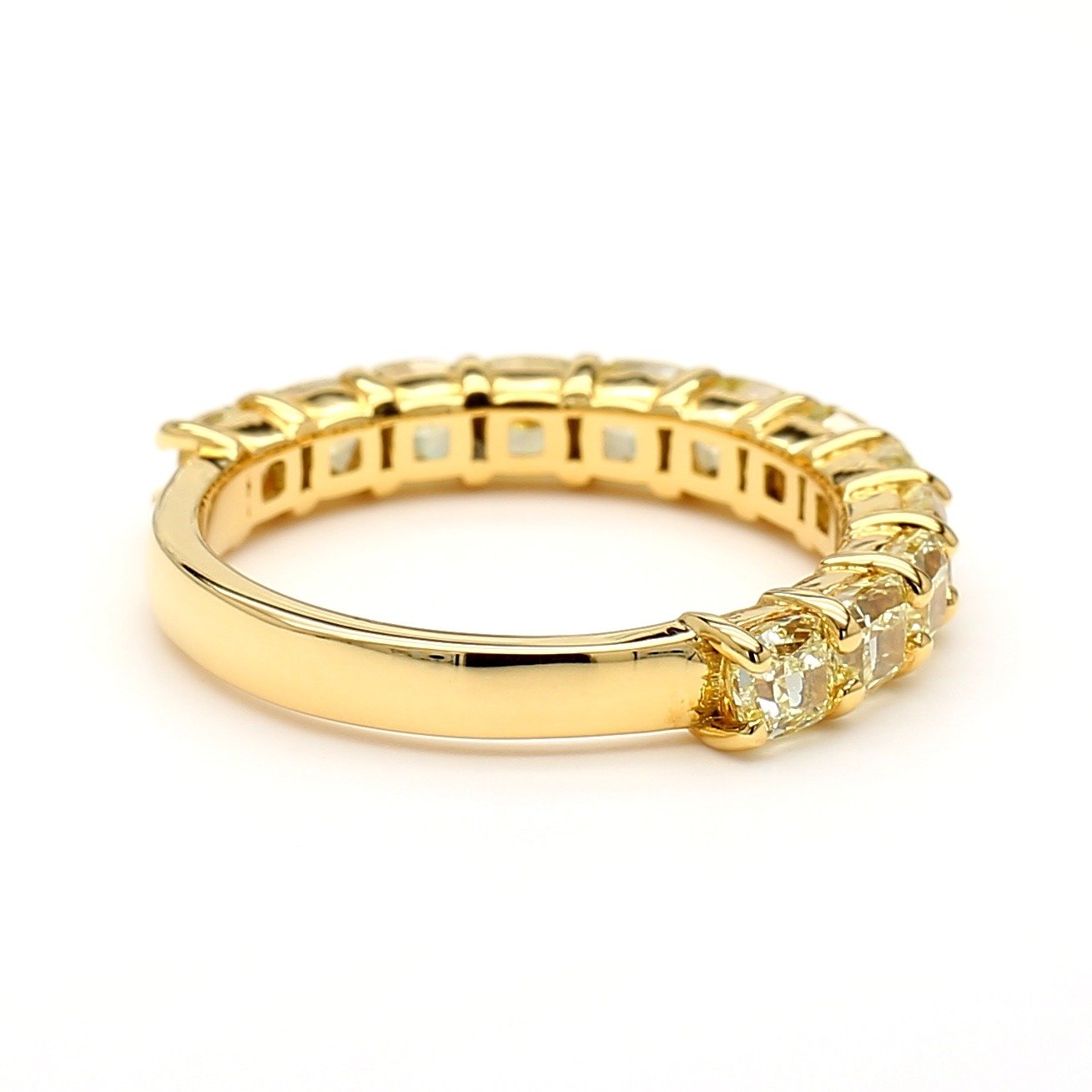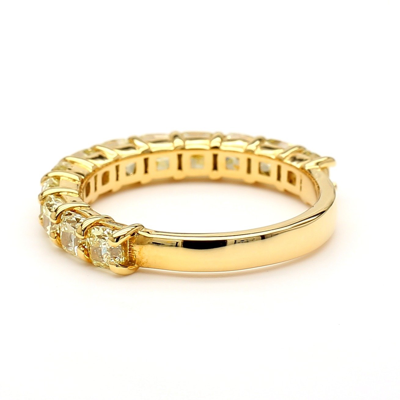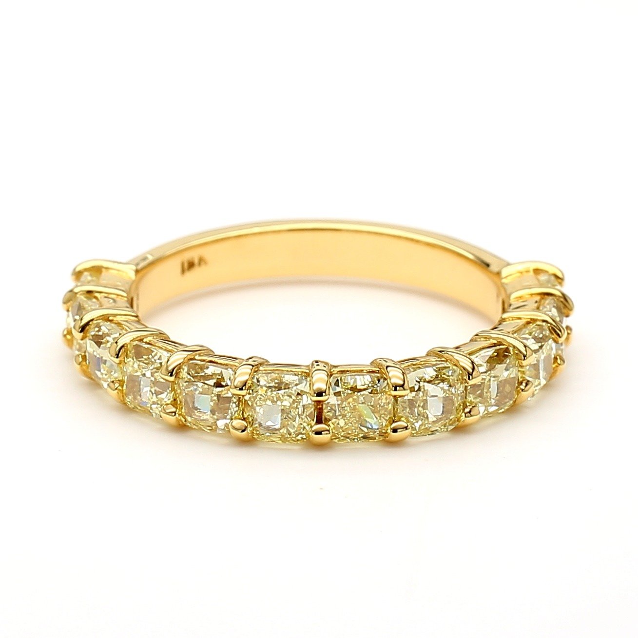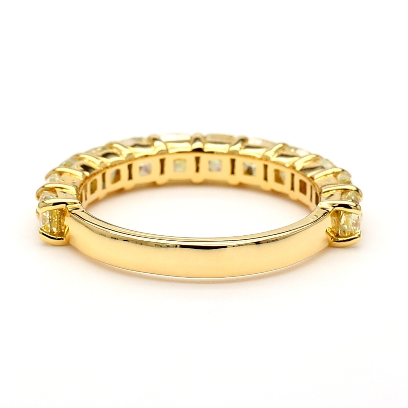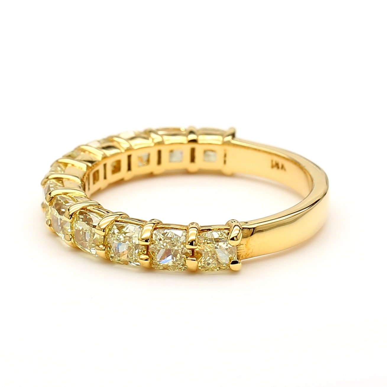 This exquisite half-way wedding band features a continuous row of dazzling fancy yellow cushion-cut diamonds, each meticulously set to showcase their vibrant hue and brilliant sparkle. The warm, golden tones of the diamonds create a striking and luxurious look, perfect for adding a touch of elegance and sophistication to any bridal set or as a standout piece on its own.