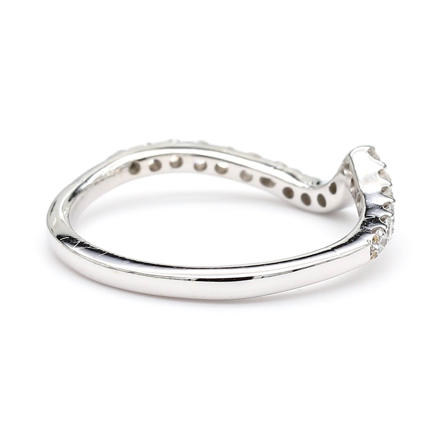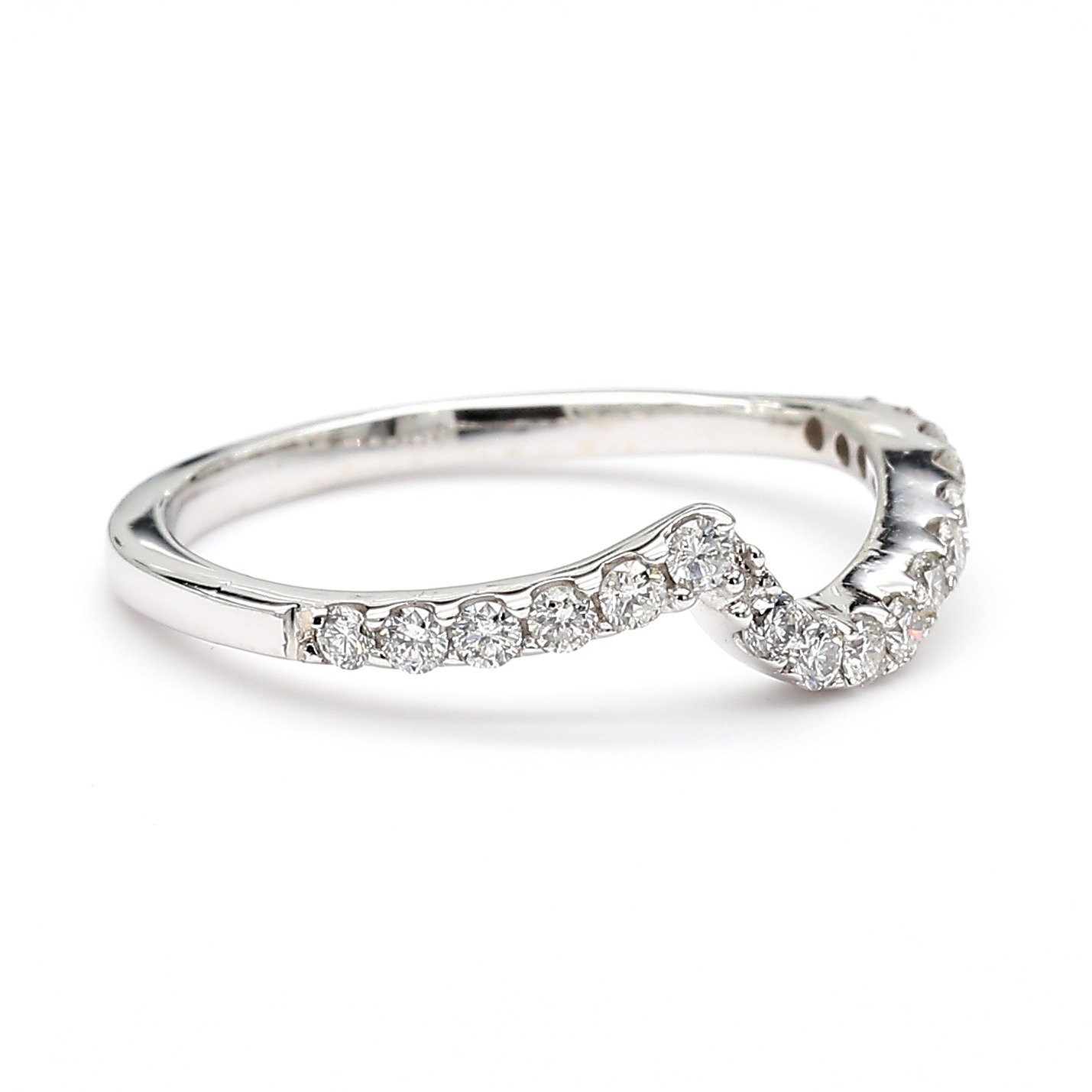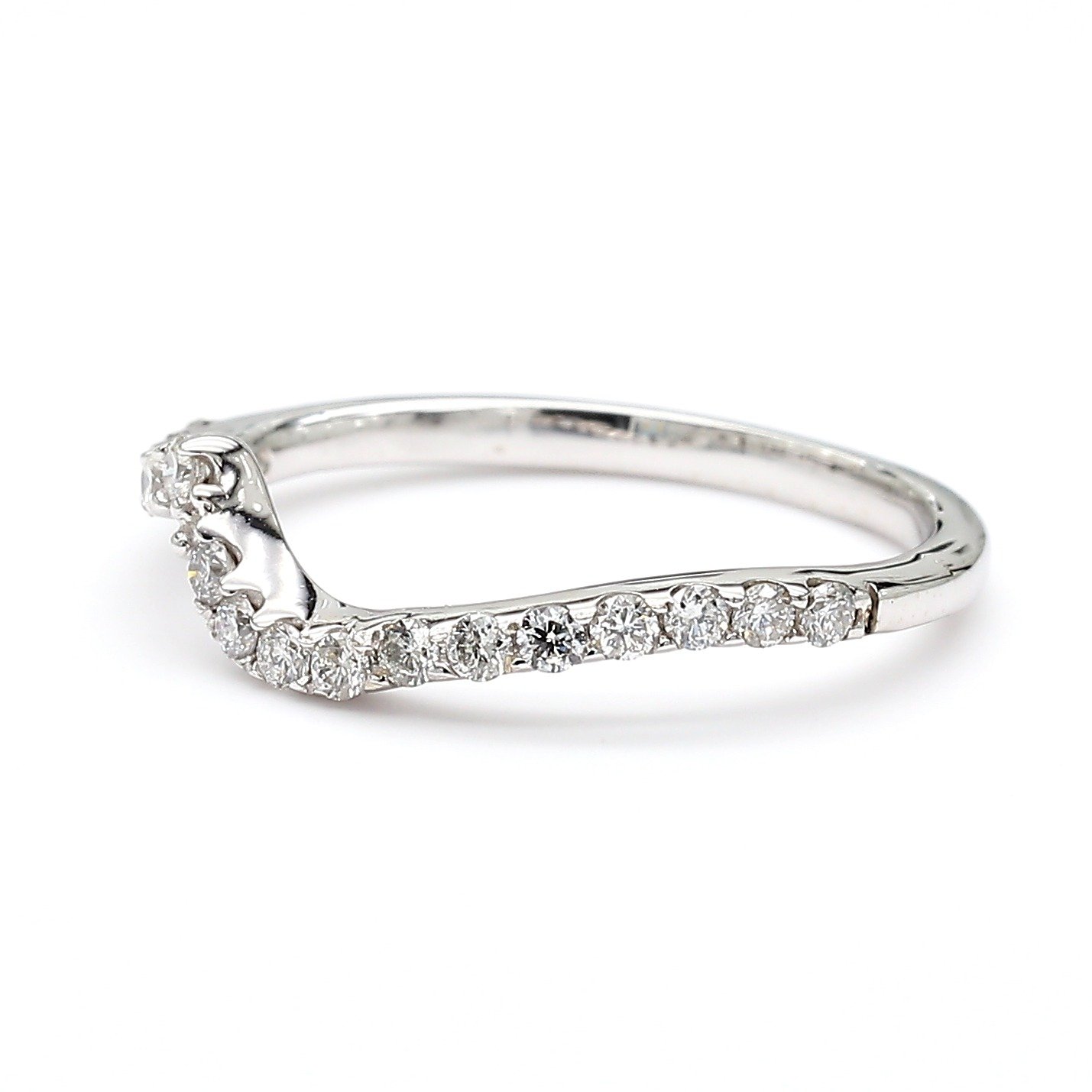 This is a beautifully crafted curved diamond wedding band, designed to complement an engagement ring or be worn alone as a delicate statement piece. The band is made of a high-quality precious metal, likely white gold or platinum, with a gentle contour that allows it to fit seamlessly around a solitaire or halo engagement ring. The band features a row of brilliant round-cut diamonds, elegantly set in a shared prong or pave setting, enhancing the ring's sparkle and sophistication. The graceful wave-like curve adds a touch of uniqueness, making it a perfect choice for those who appreciate both classic elegance and modern