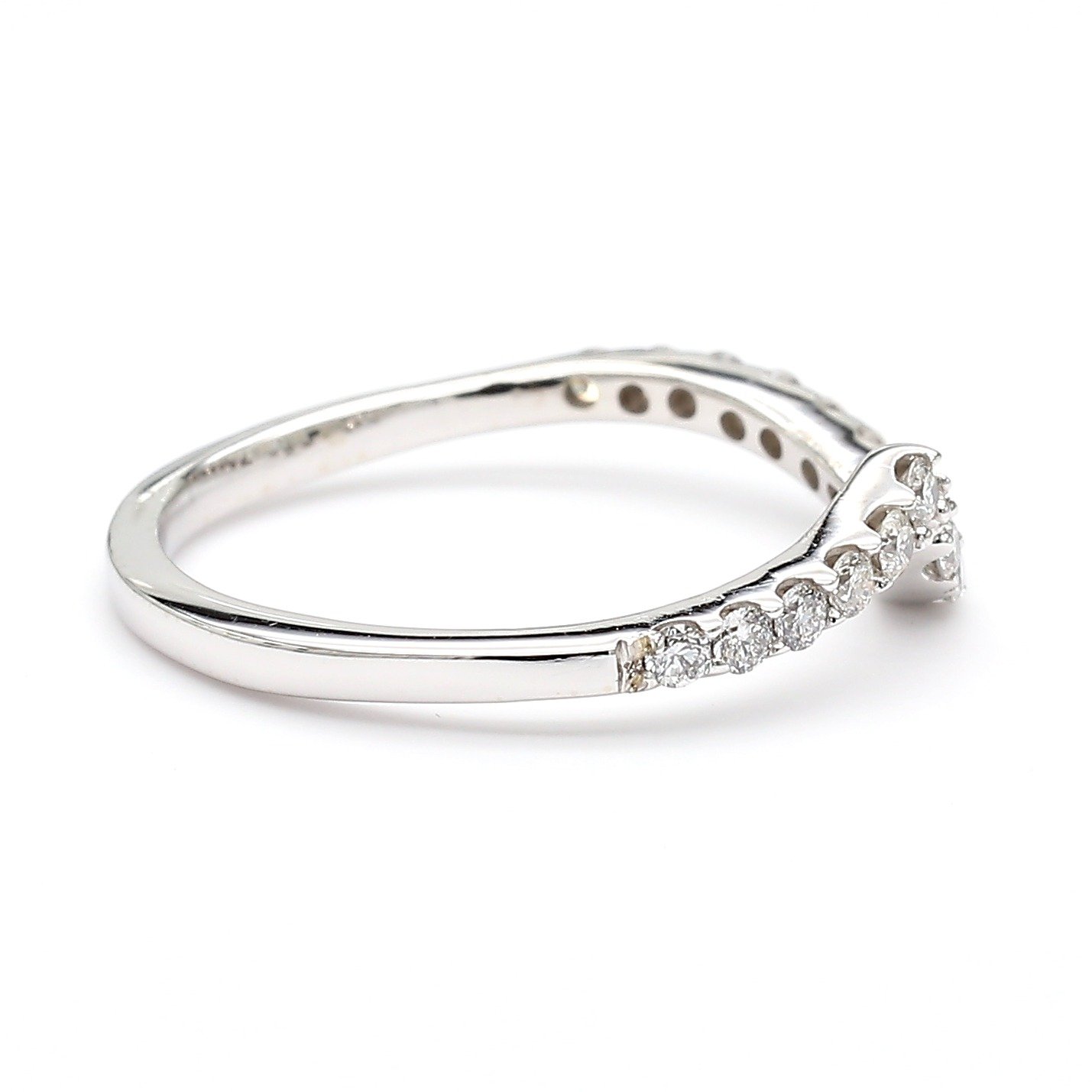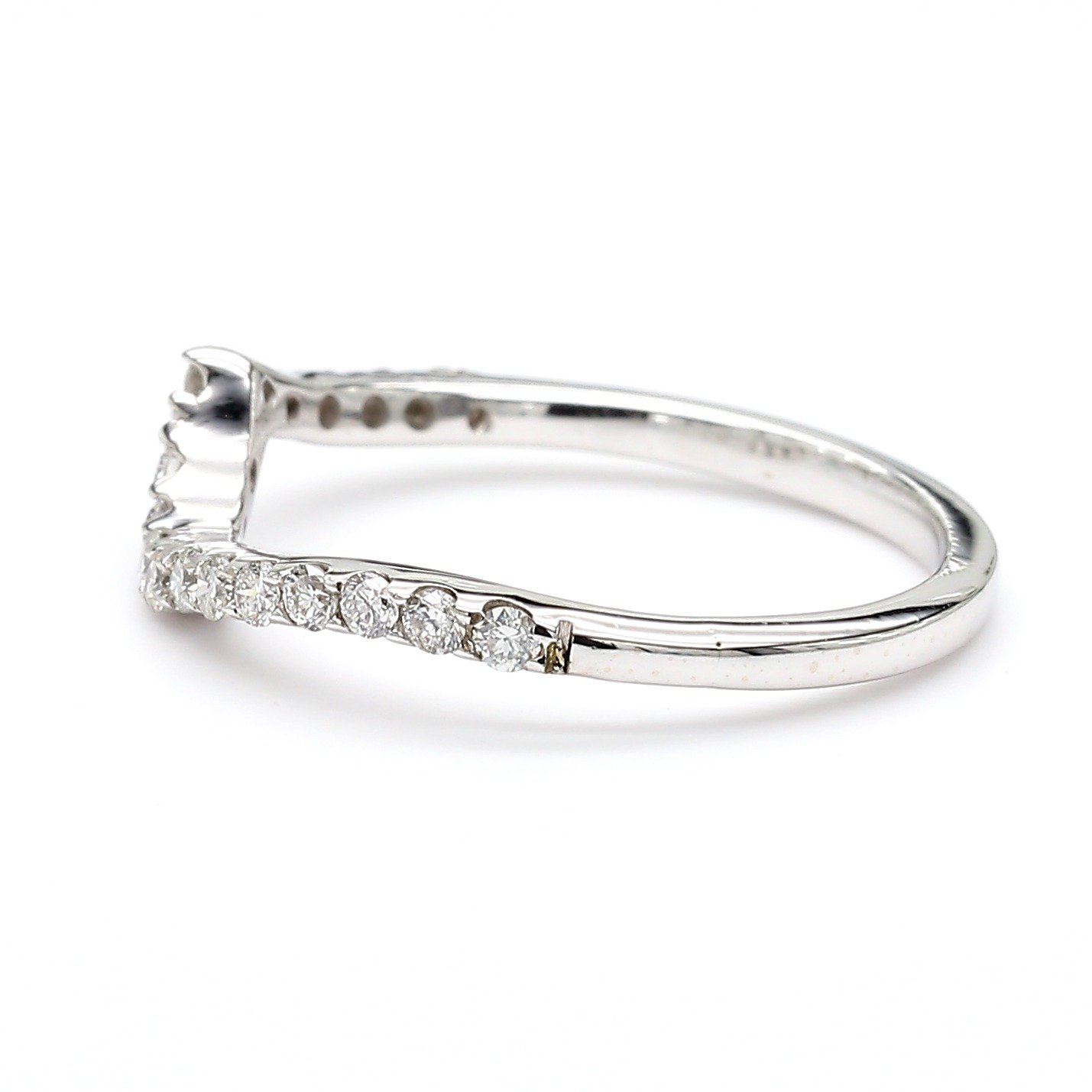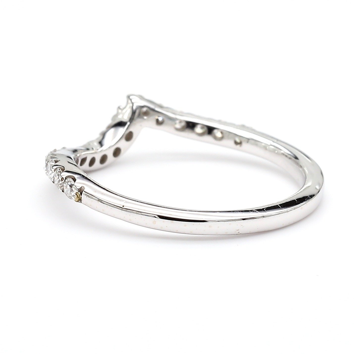 This is a beautifully crafted curved diamond wedding band, designed to complement an engagement ring or be worn alone as a delicate statement piece. The band is made of a high-quality precious metal, likely white gold or platinum, with a gentle contour that allows it to fit seamlessly around a solitaire or halo engagement ring. The band features a row of brilliant round-cut diamonds, elegantly set in a shared prong or pave setting, enhancing the ring's sparkle and sophistication. The graceful wave-like curve adds a touch of uniqueness, making it a perfect choice for those who appreciate both classic elegance and modern