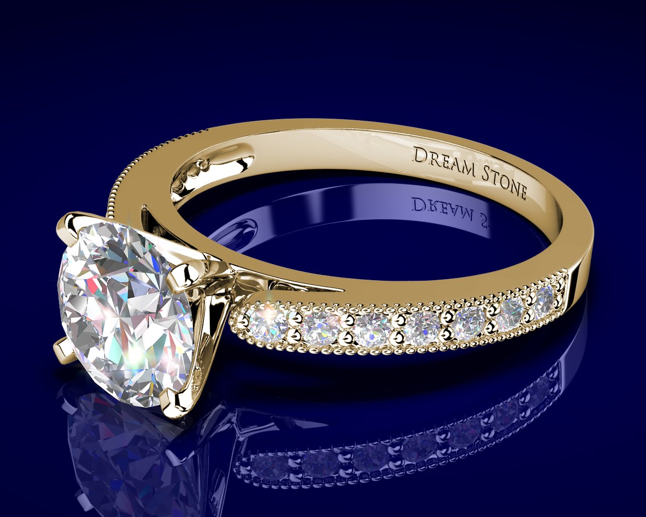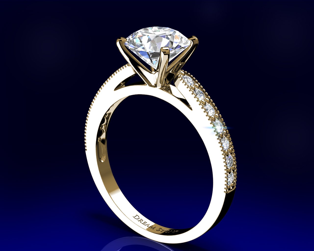 The Abigail set diamond engagement ring with matching wedding band features milgrain edges for just the right touch of vintage style and feel while still keeping an elegant and classic look. The band rises slightly to accentuate your center stone. The perfectly matching wedding band sits flush against the engagement ring. Customize this set with your choice of diamond and preferred metal.