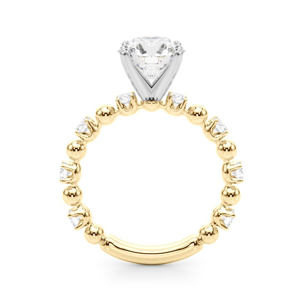 The Amber ring features a round brilliant-cut center diamond secured in a classic four-prong setting. The band is designed with an alternating pattern of high-polish metal beads and round diamonds set in prongs, creating a distinctive beaded look that adds both texture and sparkle. The symmetrical arrangement along the shank provides a balanced and elegant appearance while maintaining a modern twist on the traditional solitaire style.