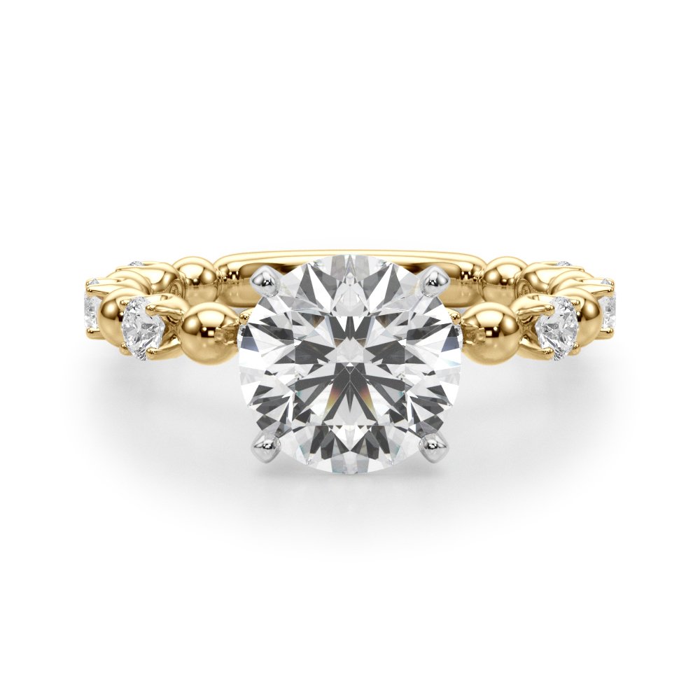 The Amber ring features a round brilliant-cut center diamond secured in a classic four-prong setting. The band is designed with an alternating pattern of high-polish metal beads and round diamonds set in prongs, creating a distinctive beaded look that adds both texture and sparkle. The symmetrical arrangement along the shank provides a balanced and elegant appearance while maintaining a modern twist on the traditional solitaire style.