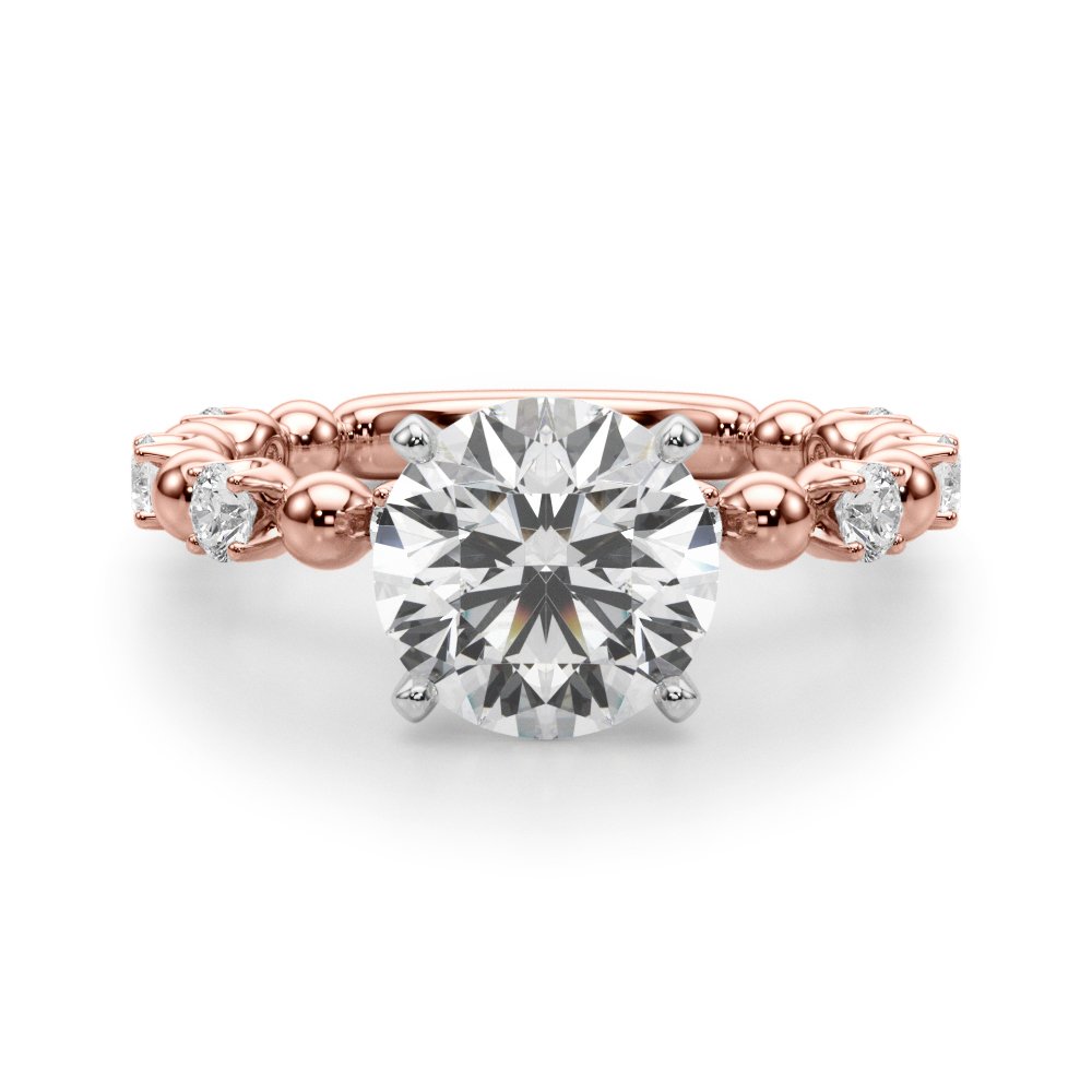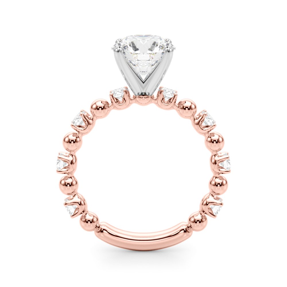 The Amber ring features a round brilliant-cut center diamond secured in a classic four-prong setting. The band is designed with an alternating pattern of high-polish metal beads and round diamonds set in prongs, creating a distinctive beaded look that adds both texture and sparkle. The symmetrical arrangement along the shank provides a balanced and elegant appearance while maintaining a modern twist on the traditional solitaire style.