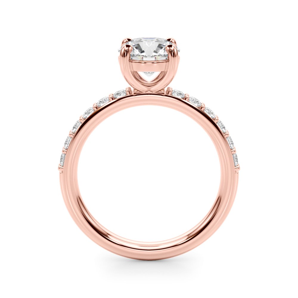 The Amelia diamond engagement ring features pave-set diamonds halfway down the band. Your center diamond is secured in a basket style crown that sits on top of the band to allow for a wedding band to sit flush against it. You can customize this setting with an array of options, include a hidden halo, diamonds 3/4 way around, or all the way around. Choose your metal preference and center diamond to complete your ring.