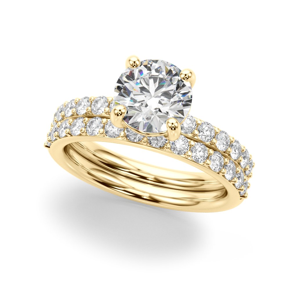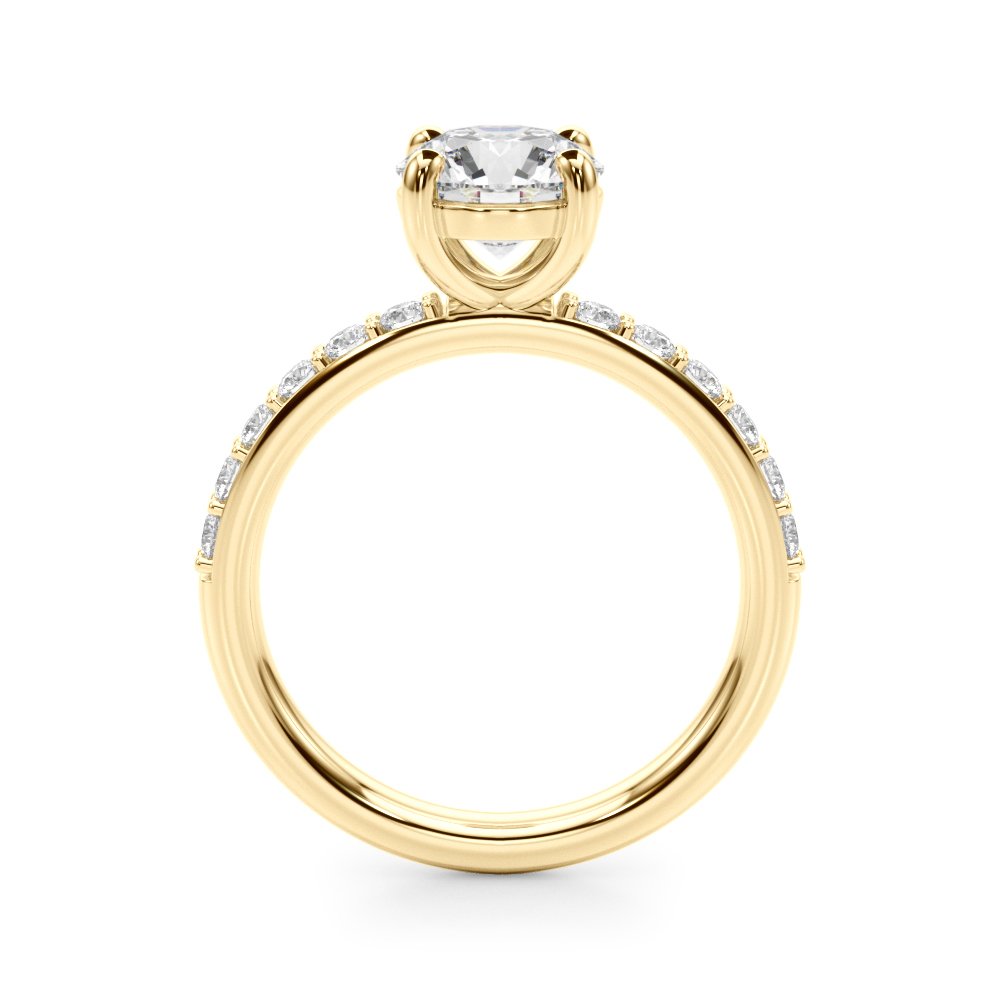 The Amelia diamond engagement ring features pave-set diamonds half way down the band. Your center diamond is secured in a basket style crown that sits on top of the band to allow for a wedding band to sit flush against it. You can customize this setting with an array of options, include a hidden halo, diamonds 3/4 way around, or all the way around. Choose your metal preference and center diamond to complete your ring.