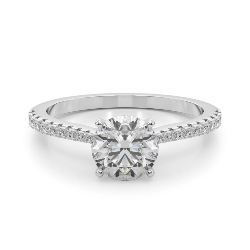 The Audrey Diamond Engagement Ring features a thin row of pave-set round brilliant diamonds. The band tapers gently upwards towards the center stone. Customize this setting with your choice of center diamond and your favorite precious metal color.