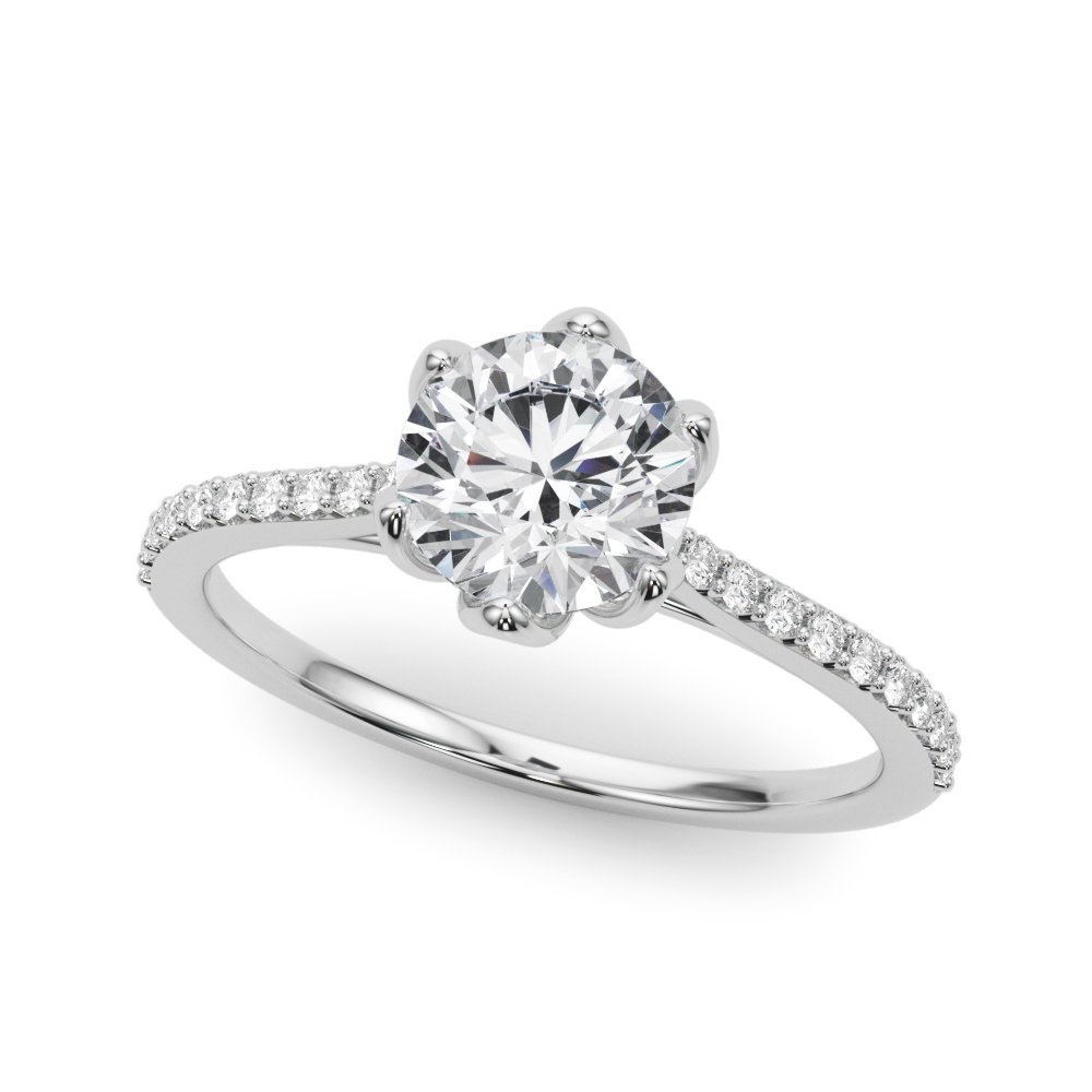 The GIA Diamond Engagement Ring features a sleek and refined silhouette with a delicate band adorned with French pavé-set diamonds along the upper shank. The elegant four-prong setting is elevated by a distinctive open cathedral design, where the prongs gracefully curve upward and inward to cradle the center stone. This airy architecture allows maximum light exposure for enhanced brilliance while maintaining a secure hold. The high-polish finish and clean lines create a modern yet timeless profile. Designed to accommodate various center stone shapes and sizes.