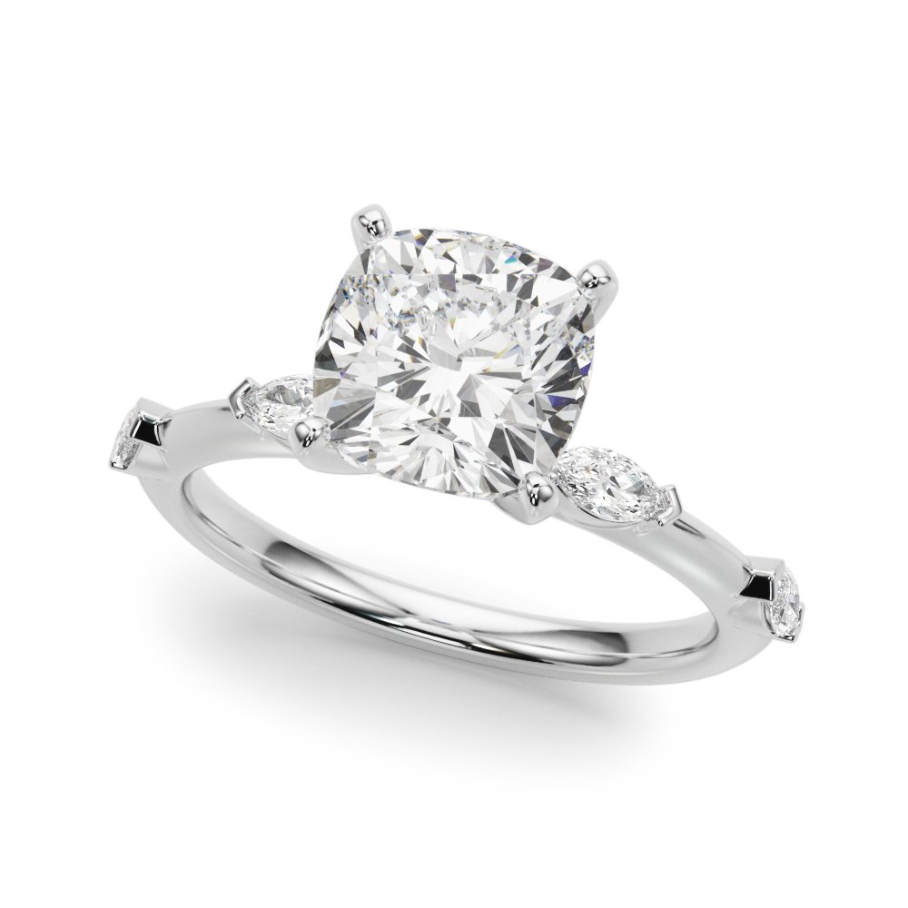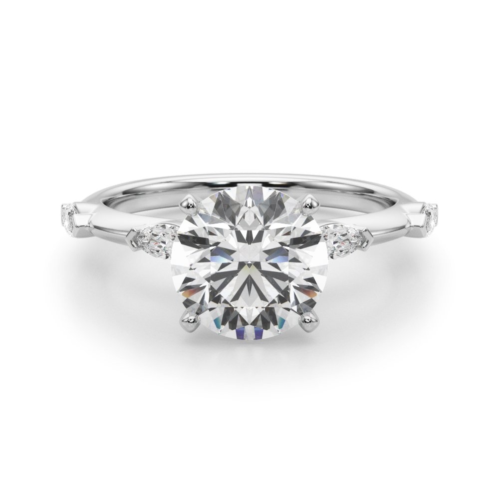 The Azalea Diamond Engagement Ring is a refined three-stone setting that blends timeless elegance with modern flair. Featuring a brilliant round center diamond accented by two marquise side stones, the design creates a graceful, elongated silhouette that draws the eye toward the center. Delicate bezel-set round diamonds on each shoulder add a subtle sparkle and architectural charm. Crafted in your choice of precious metals, the Azalea ring offers a balanced, romantic look—perfect for those who appreciate clean lines, symmetry, and distinctive beauty.