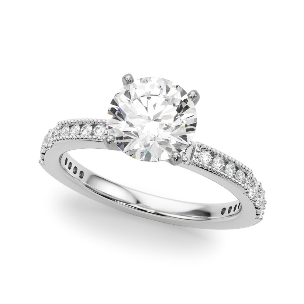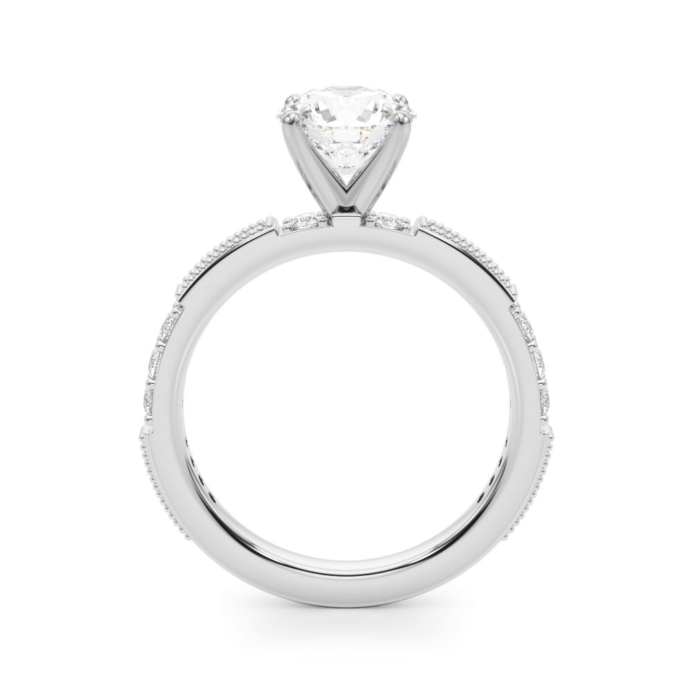 The Belle Diamond Engagement Ring features a round brilliant center diamond secured in a four-prong setting. The shank is adorned with a single row of pave-set round diamonds extending halfway down each side, providing added brilliance along the band. The band has a slightly tapered silhouette, designed to draw focus toward the center stone, and is finished with a high-polish surface for a clean, reflective appearance. The setting maintains a low to medium profile for balanced wearability and is engineered for durability and precision.