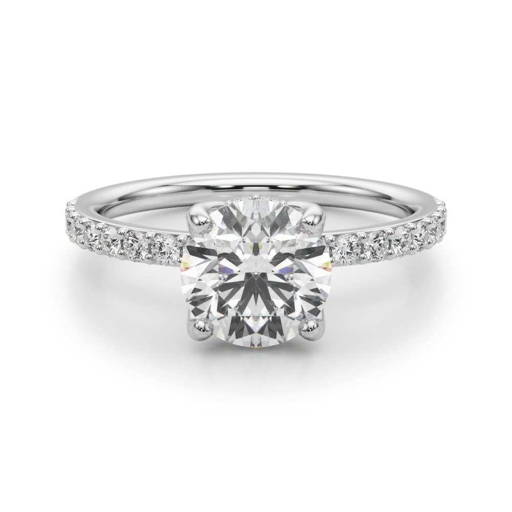 The Brielle Diamond Engagement Ring features a refined, French-set diamond band that elegantly tapers toward a Tulip four-prong head, designed to highlight a round brilliant center stone. The band is crafted in high-polish yellow gold and showcases a continuous row of meticulously set round diamonds along the upper half of the shank for added brilliance. The white gold basket setting includes a hidden halo of pavé diamonds beneath the center stone, offering sparkle from every angle. This design combines classic elegance with modern detail, and can accommodate a variety of center stone sizes and shapes.