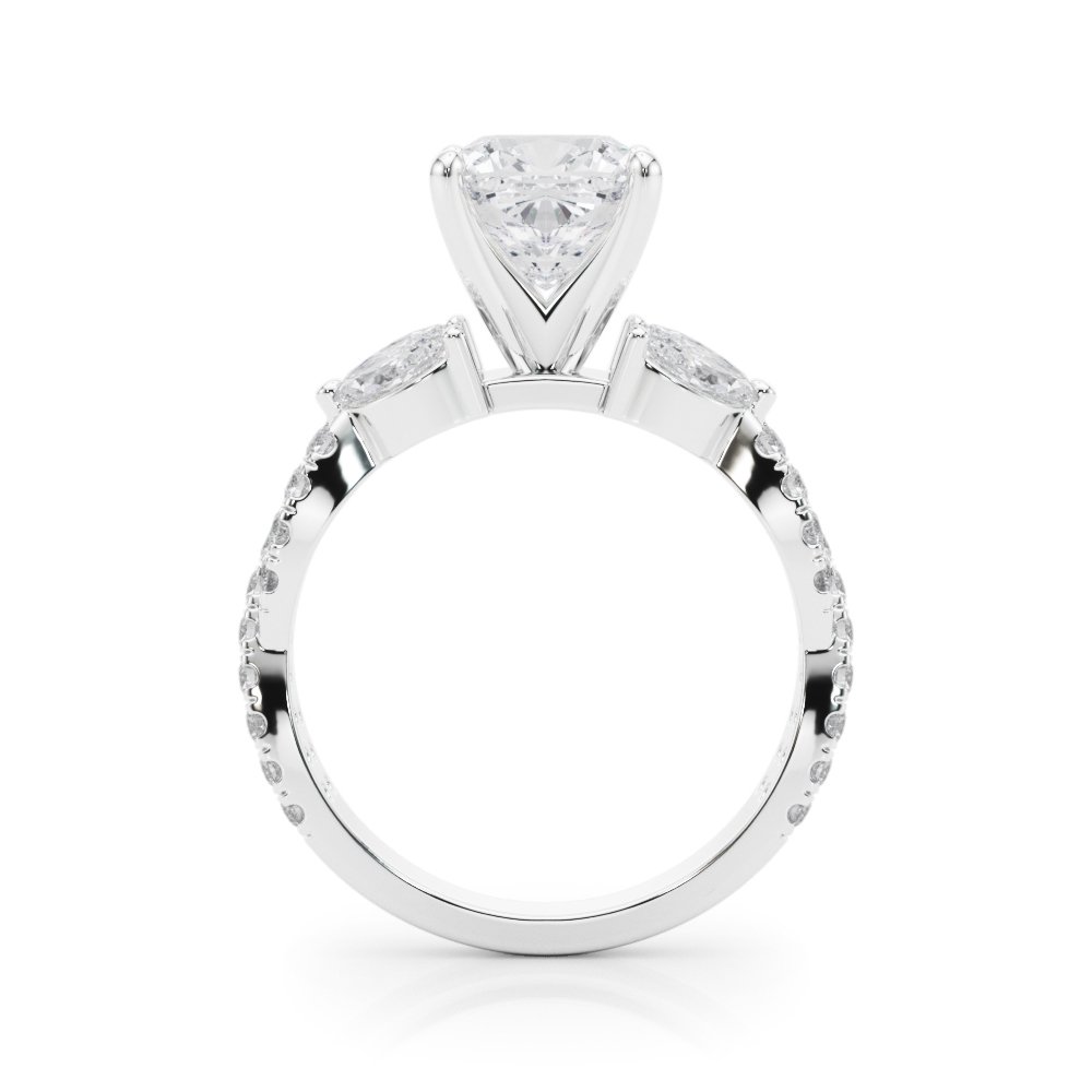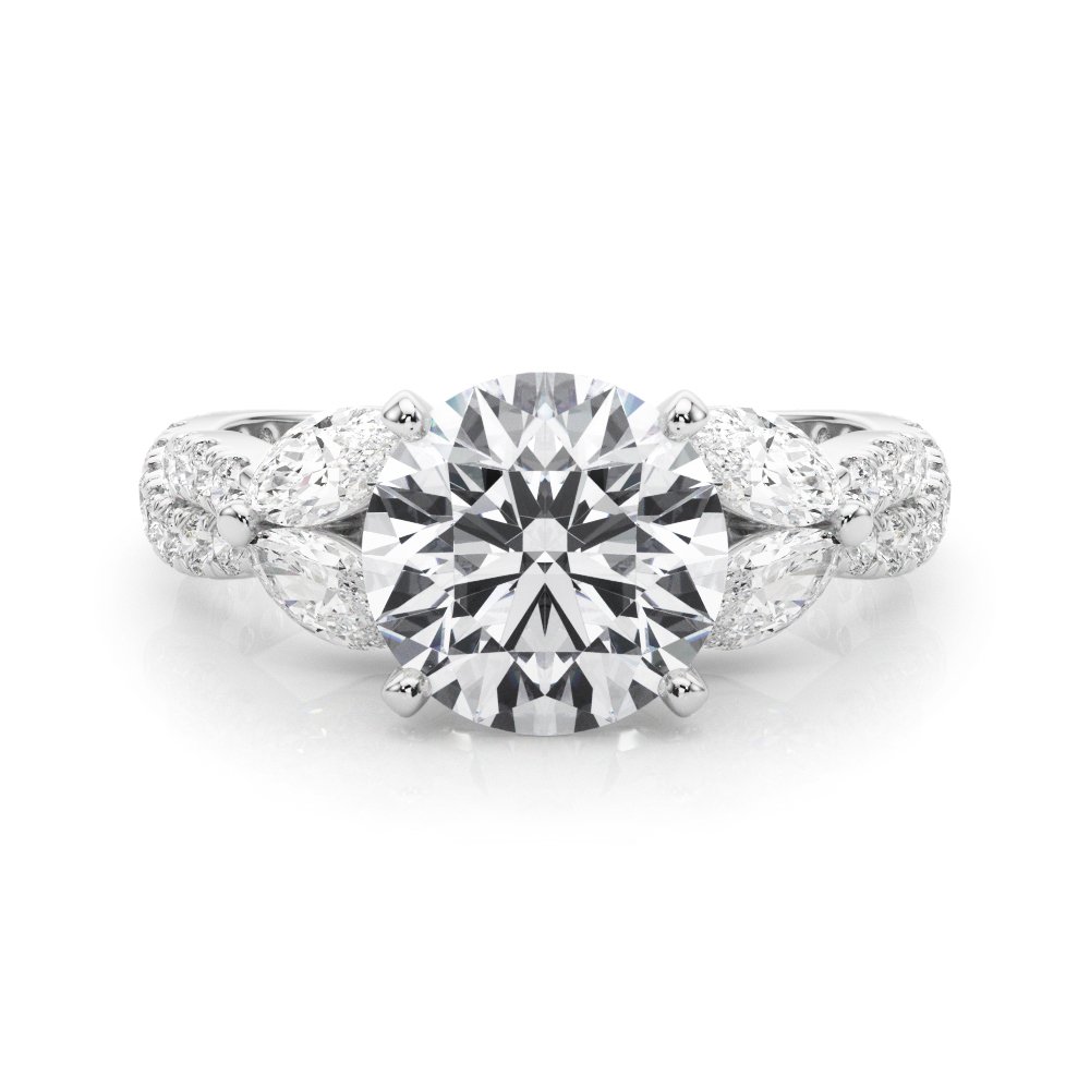 The Calista Engagement Ring is a bold and romantic design that radiates brilliance from every angle. At its center, a dazzling round diamond is set in a secure four-prong head, elevated to capture light with maximum fire and sparkle. Flanking the center stone are perfectly matched marquise-cut diamonds, creating an elegant, wing-like silhouette that enhances the ring’s symmetry and grace. The band is adorned with a row of pavé-set round diamonds, extending halfway down each side for continuous shimmer and added luxury. With its combination of classic round brilliance, unique marquise accents, and pavé detailing, the Calista is a striking expression of elegance and modern sophistication.