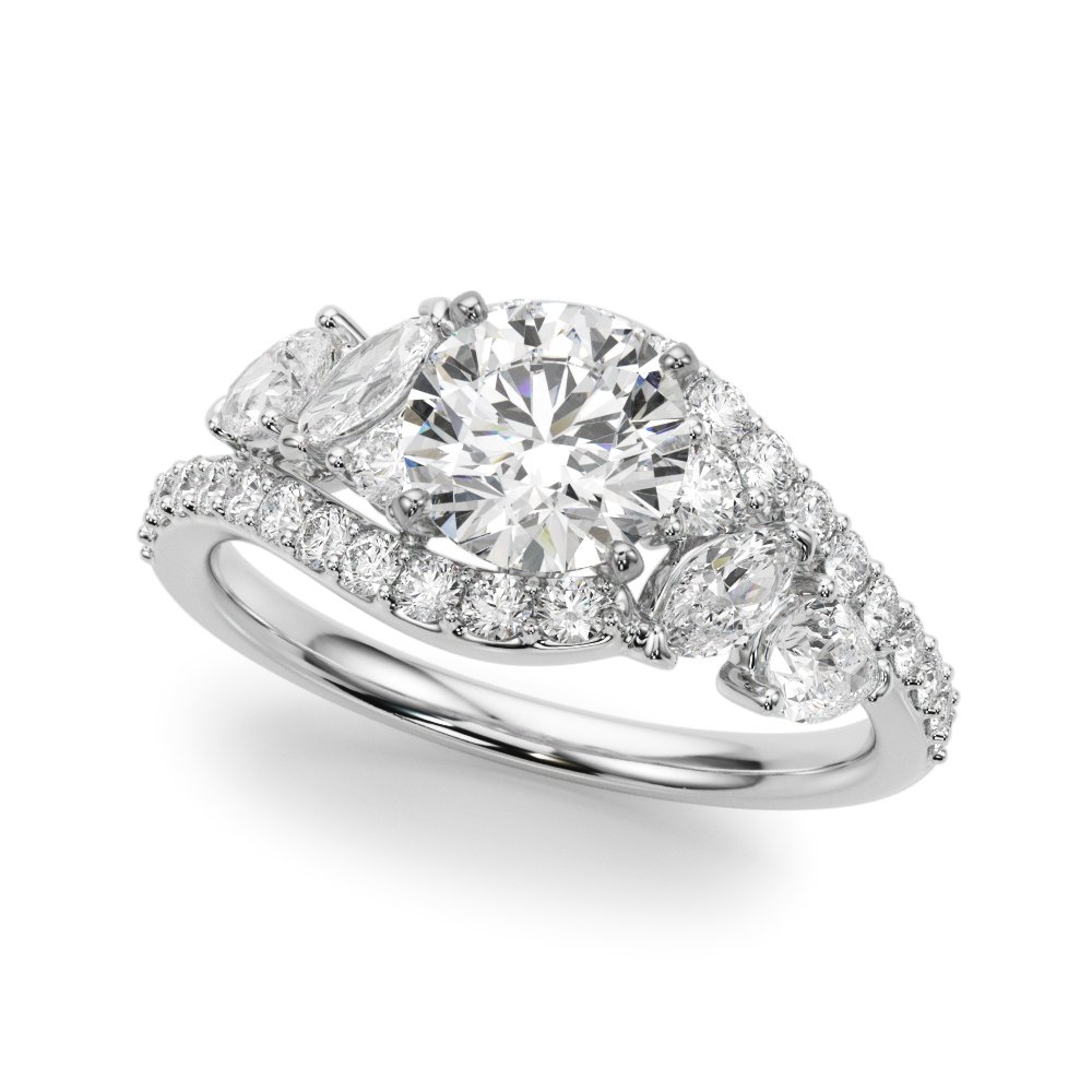 The Camille Diamond Engagement Ring features a round center diamond set within a split band design encrusted with round pavé-set diamonds. The band curves gracefully around the center, creating a soft bypass effect. Three marquise-cut diamonds are set on each side of the center stone, adding dimension and a layered look. The combination of round and marquise shapes gives the ring a dynamic, sculptural quality while maintaining a structured, elegant form.