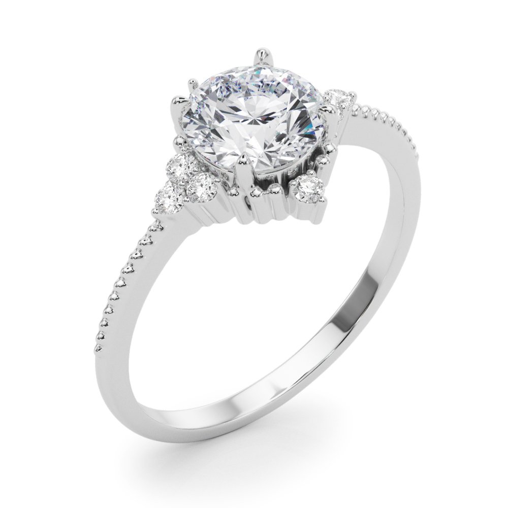 The Clara Diamond Engagement Ring features a round center diamond framed by a cluster of smaller round diamonds that extend outward in four directions, creating a softly pointed, compass-inspired silhouette. Additional round diamonds are set along the band in a fine pavé setting, adding continuous sparkle. The design blends classic elements with geometric structure for a refined and detailed appearance that highlights the center stone while introducing elegant symmetry.