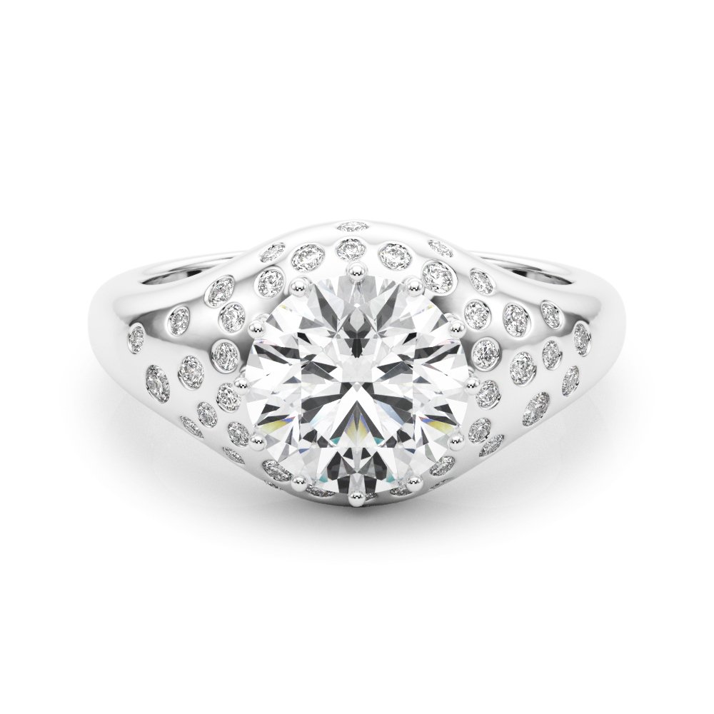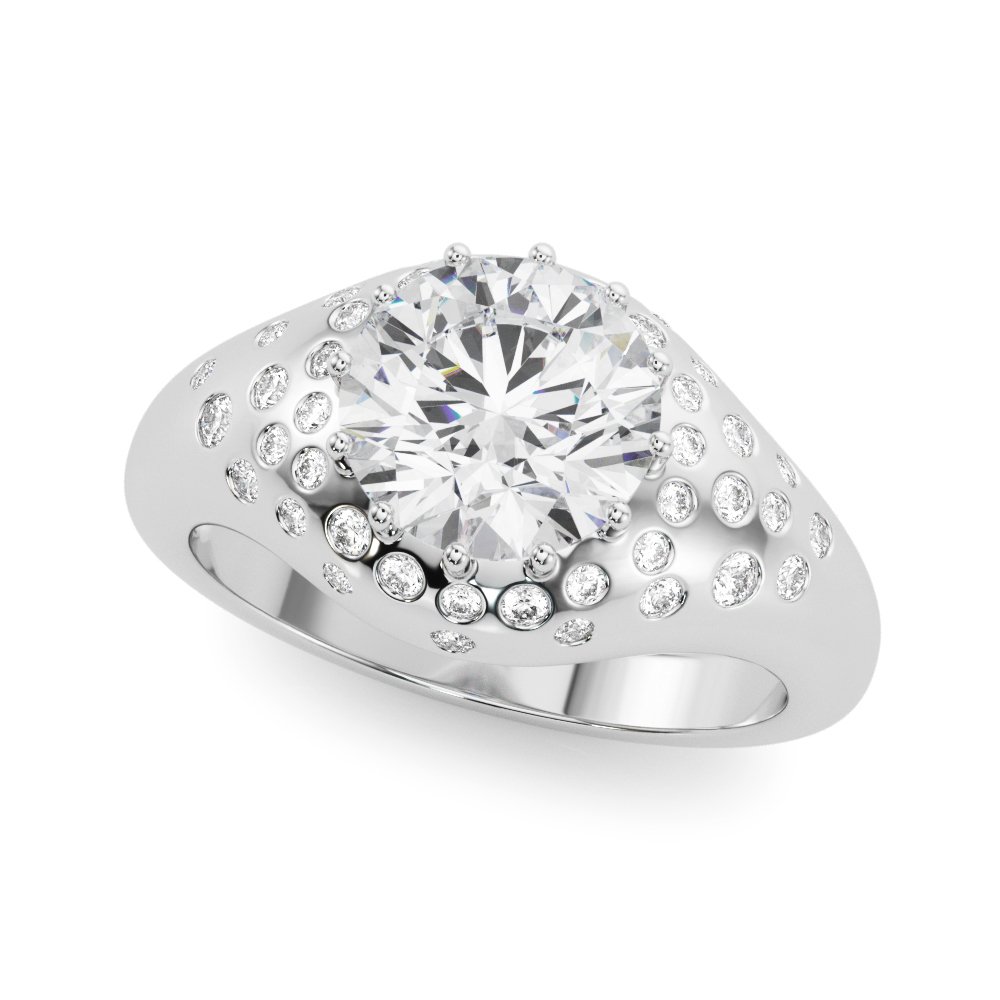 The Coral ring, features a bold, contemporary design with a large round brilliant center diamond set in multiple prongs. The wide, polished band is adorned with scattered round accent diamonds in various sizes, bezel-set directly into the metal, creating a dynamic, shimmering pattern. The arrangement of the stones gives the ring a modern, artistic look while maintaining a luxurious feel.