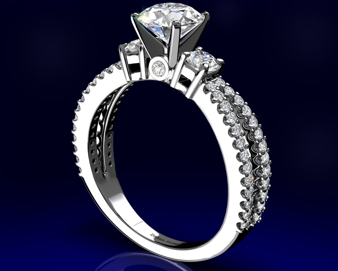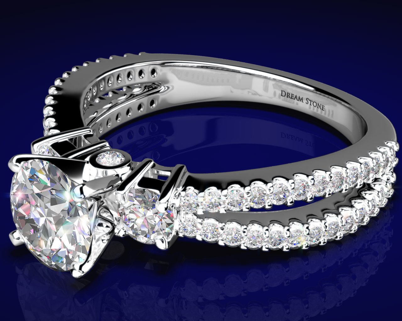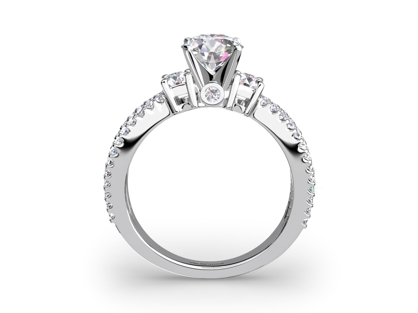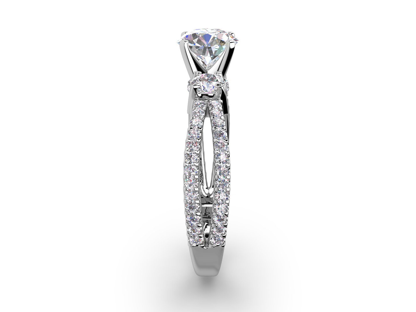 This setting features diamonds prong-set along a dual-shank. A bezel-set diamond sparkles on each side of the setting and two brilliant round diamonds complete the frame for your choice of center stone. 1 carat total side diamond weight.