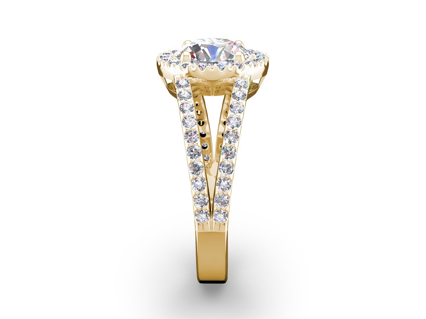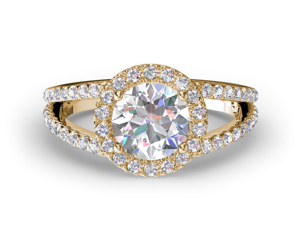 A split shank set with round diamonds opens up to a diamond halo. Sheer brilliance to compliment your choice of center diamond.